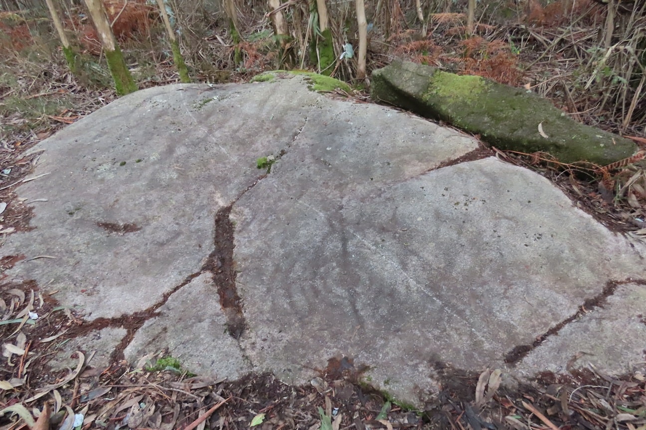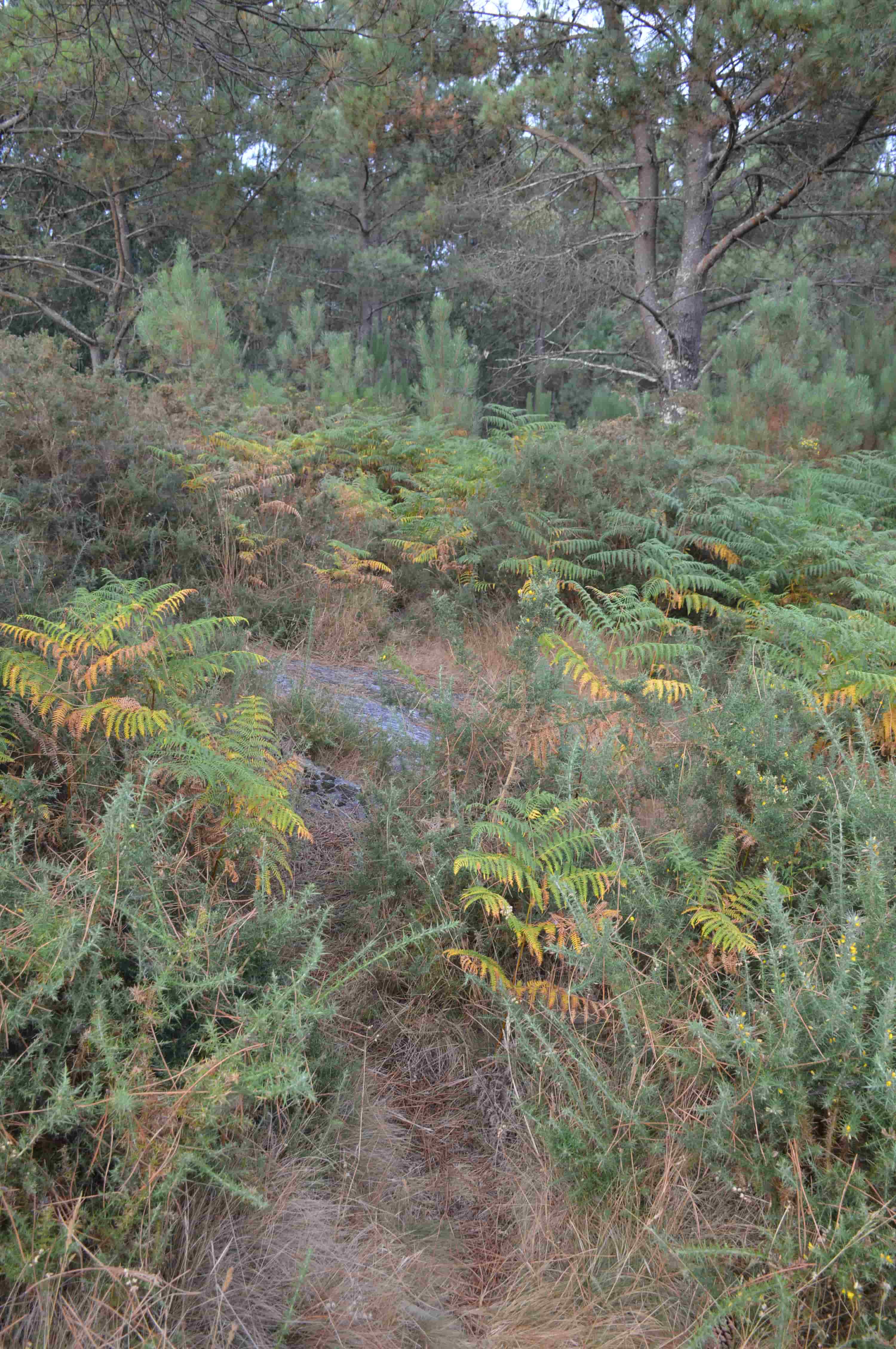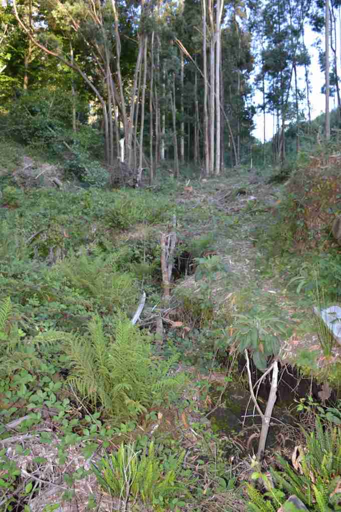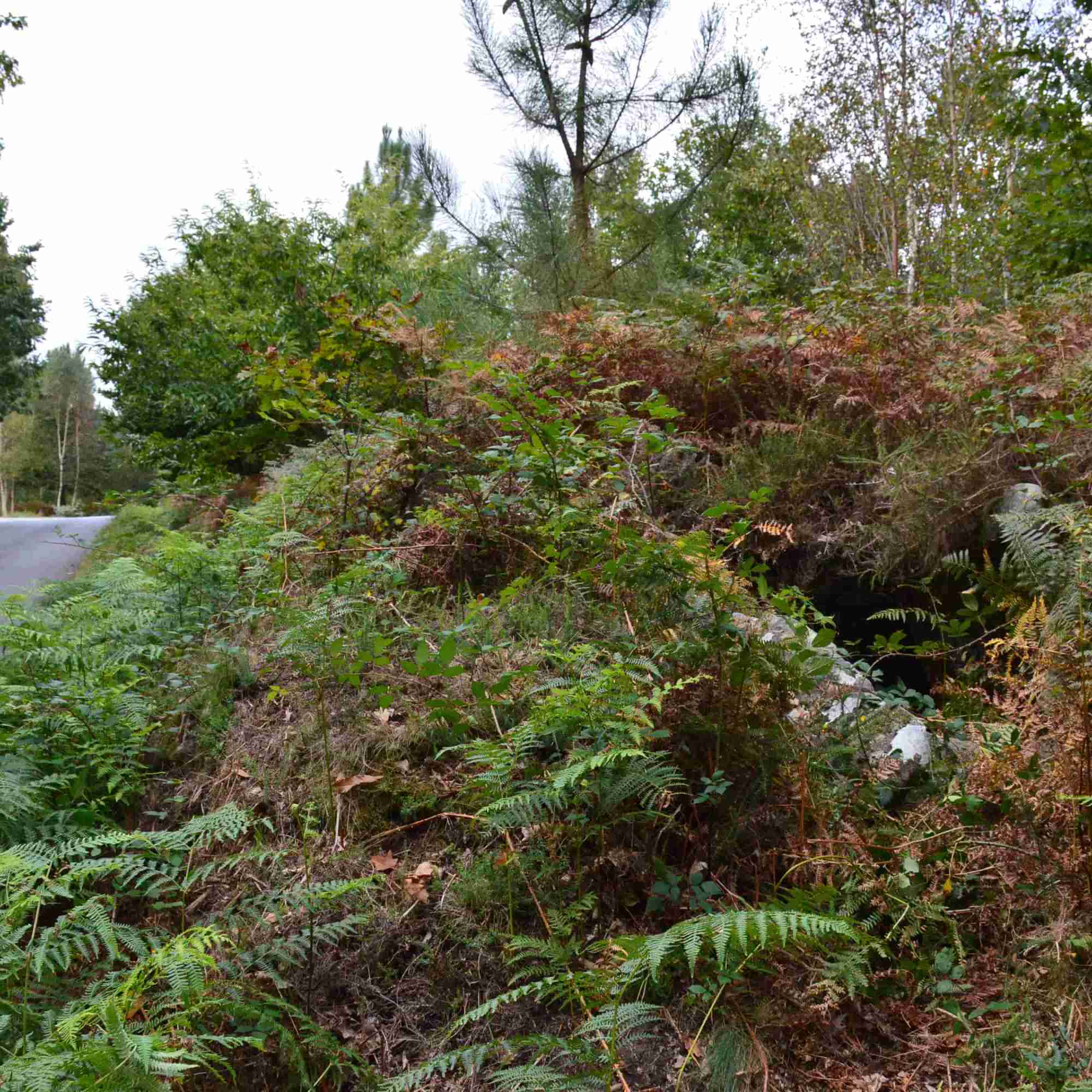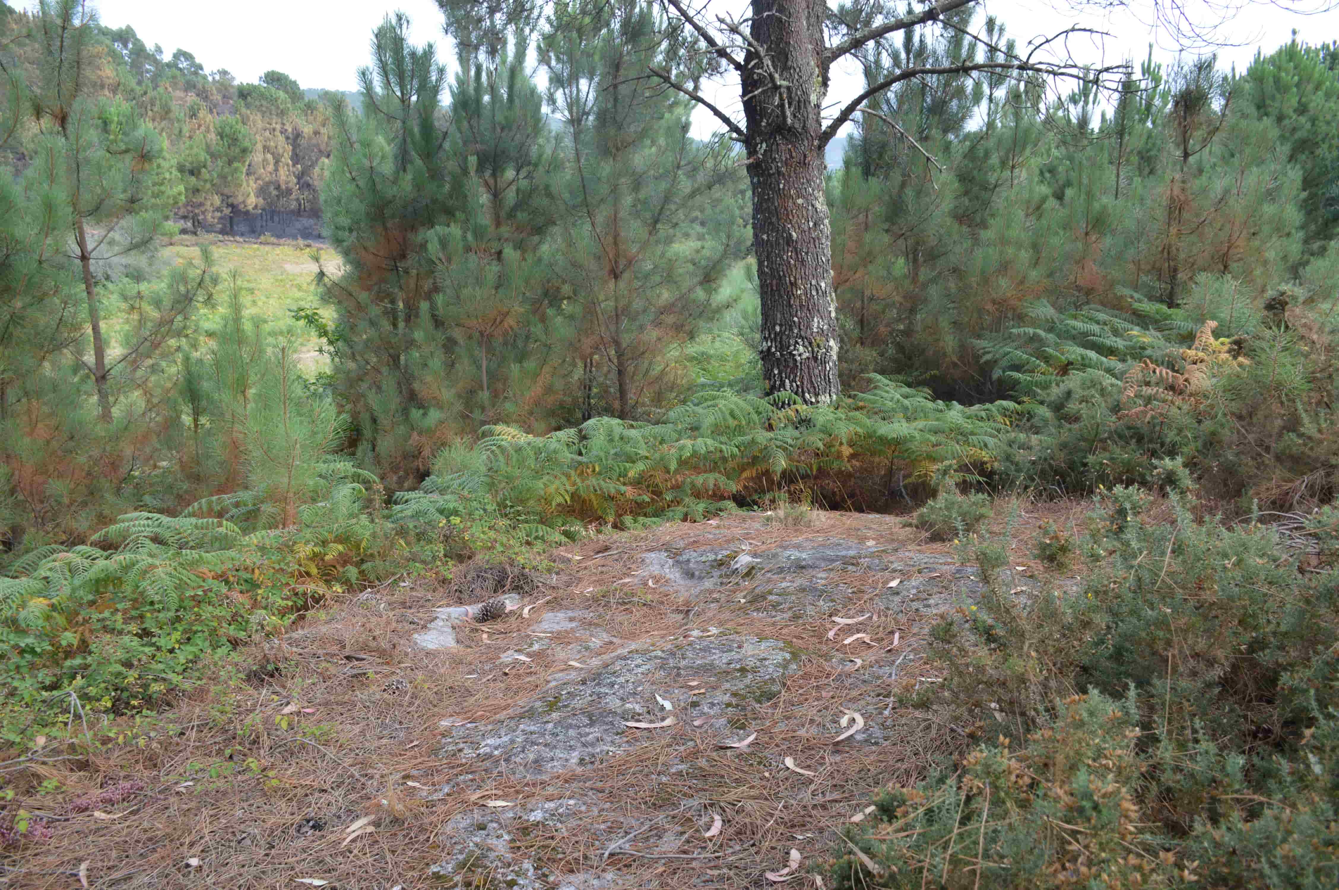 Situación na que se atopa o gravado nº3 do conxunto rupestre da Carrasca, rodeado de eucaliptos e vexetación