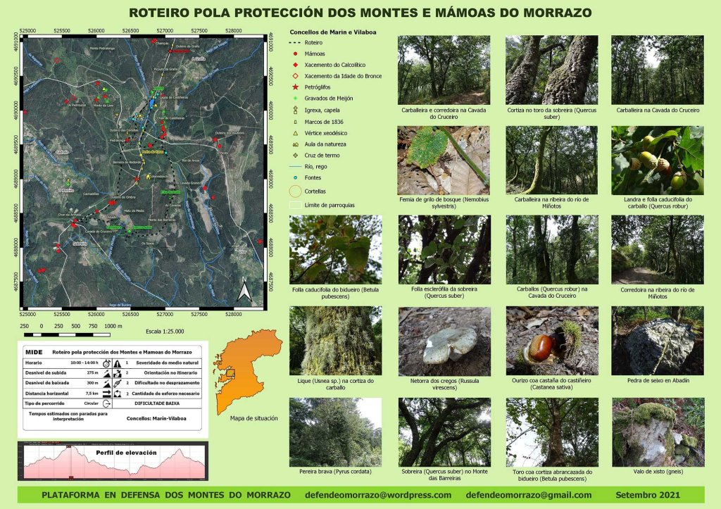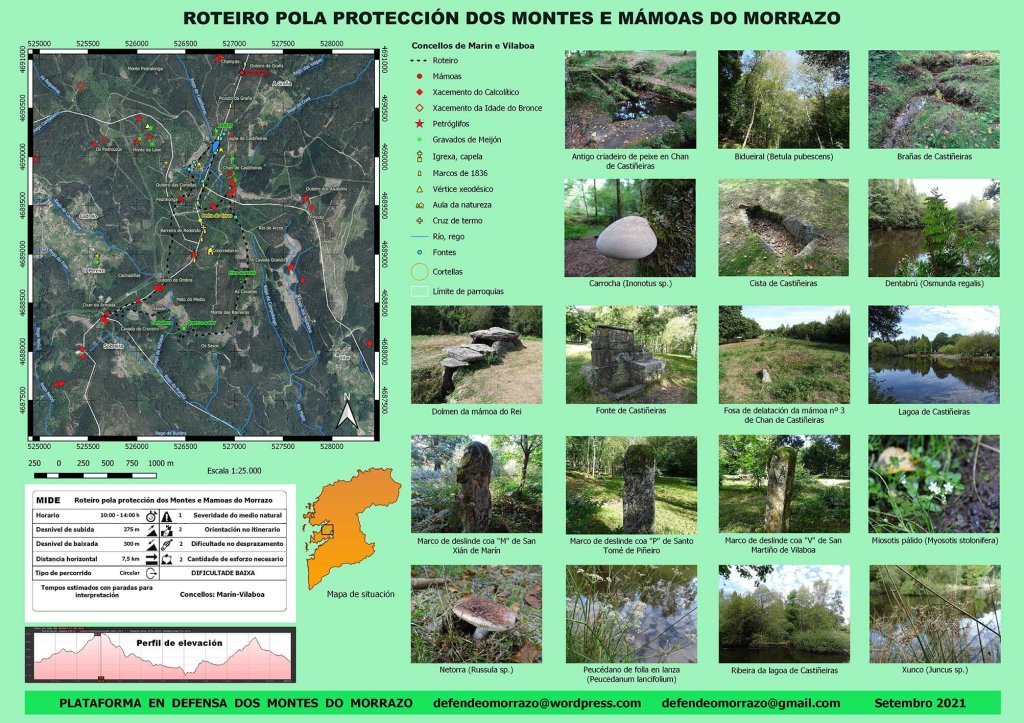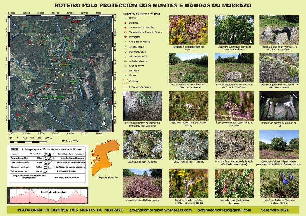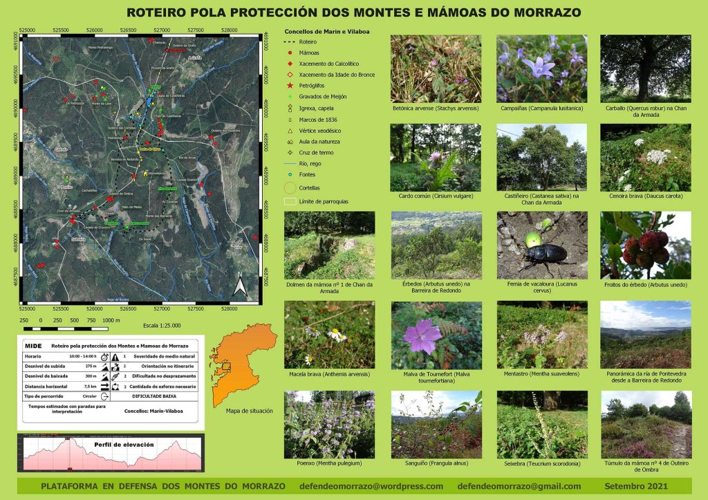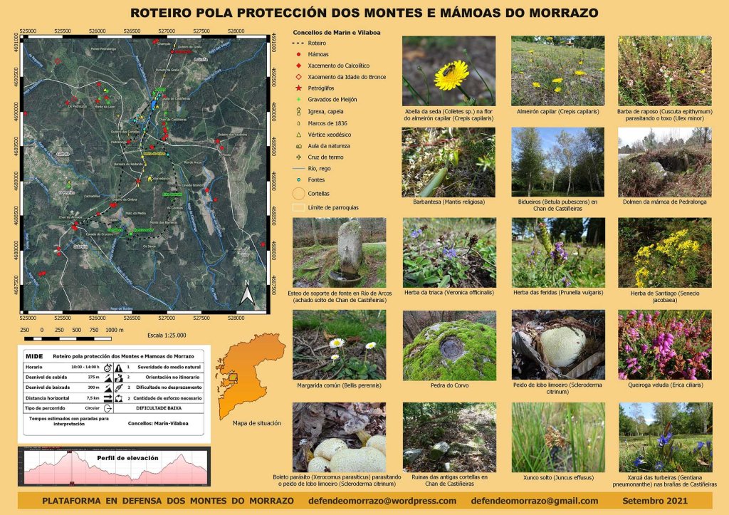 Vanse cumplir 10 anos dende a creación da Plataforma en Defensa dos Montes do Morrazo, que xurdiu como reacción social contra o proxecto de instalación dun parque eólico en Pedras Negras. Unha década despois, os muíños de vento seguen ameazando o país, mais a Plataforma Montes do Morrazo continúa co seu labor reivindicativo e, sobre todo, divulgativo, dando a coñecer a importancia, ambiental, paisaxística e cultural da bisbarra. A primeira andaina do outono percorreu boa parte do territorio no que se atopan as mámoas catalogadas nas parroquias de San Martiño e Santa Cristina de Cobres no concello de Vilaboa, e mais San Tomé de Piñeiro e San Xián de Marín no municipio de Marín, enmarcadas en solo rústico de especial protección de espazos naturais, paisaxístico, de augas e patrimonial.