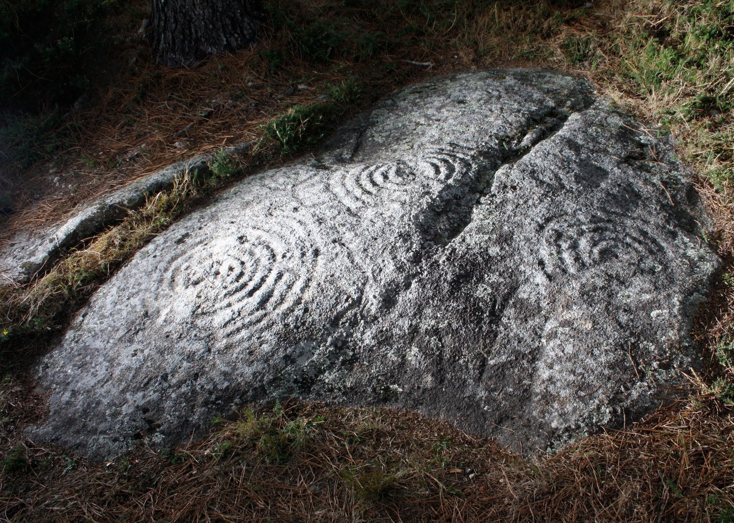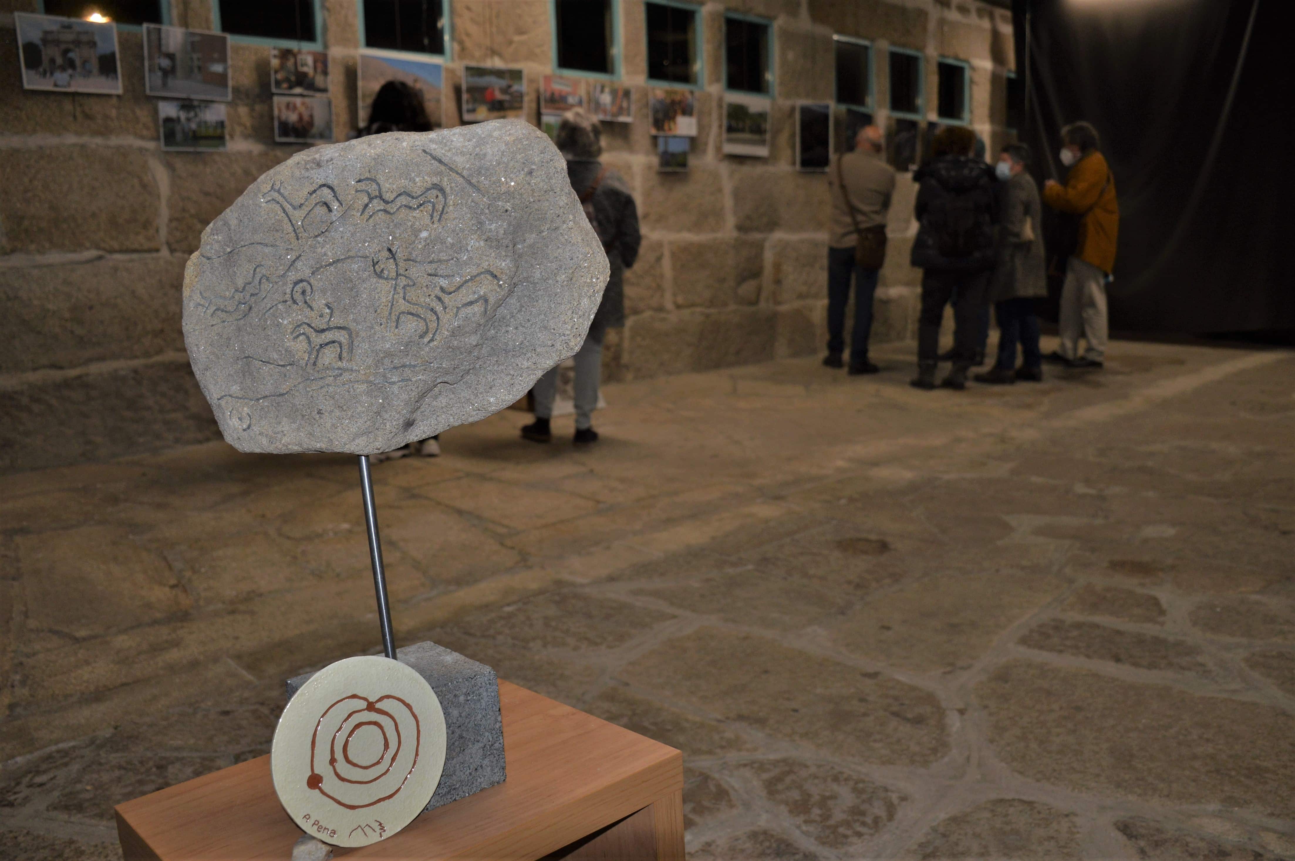Representación en pedra do petróglifo de Sete Camiños, do artesán Francisco Ameixeiras, e recreación do gravado rupestre da Pena, realizado en Alén das Olas