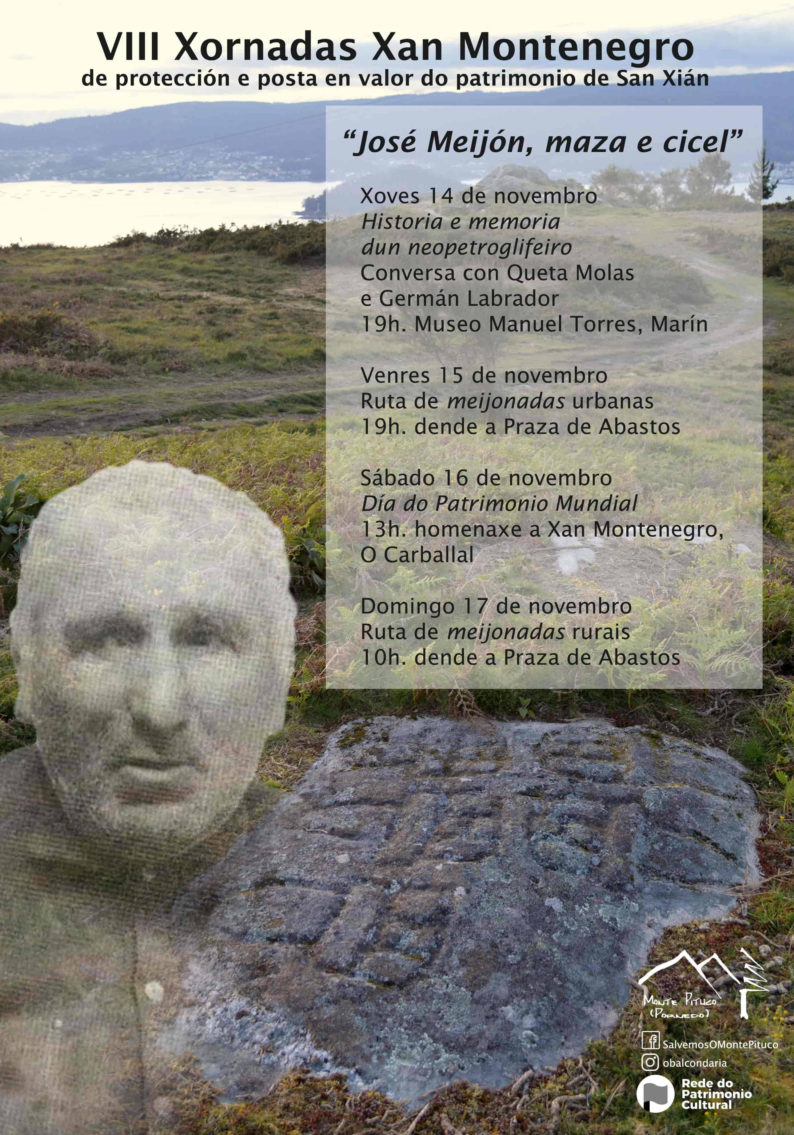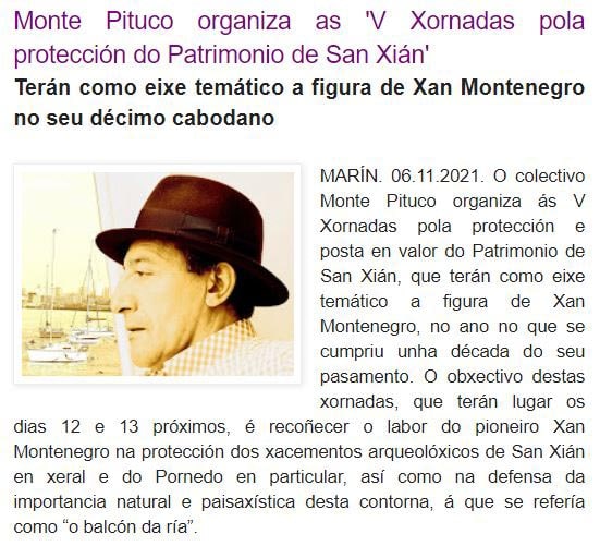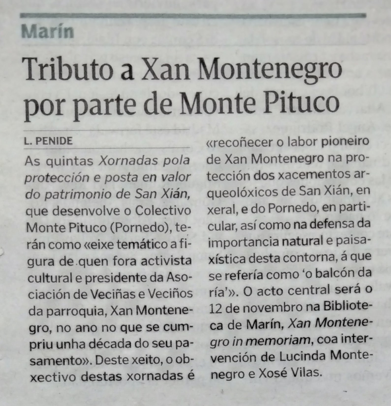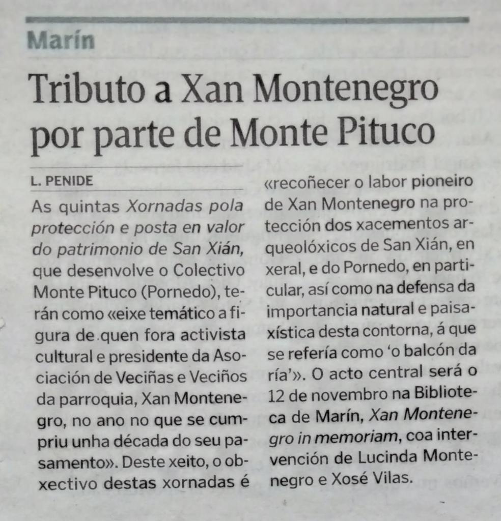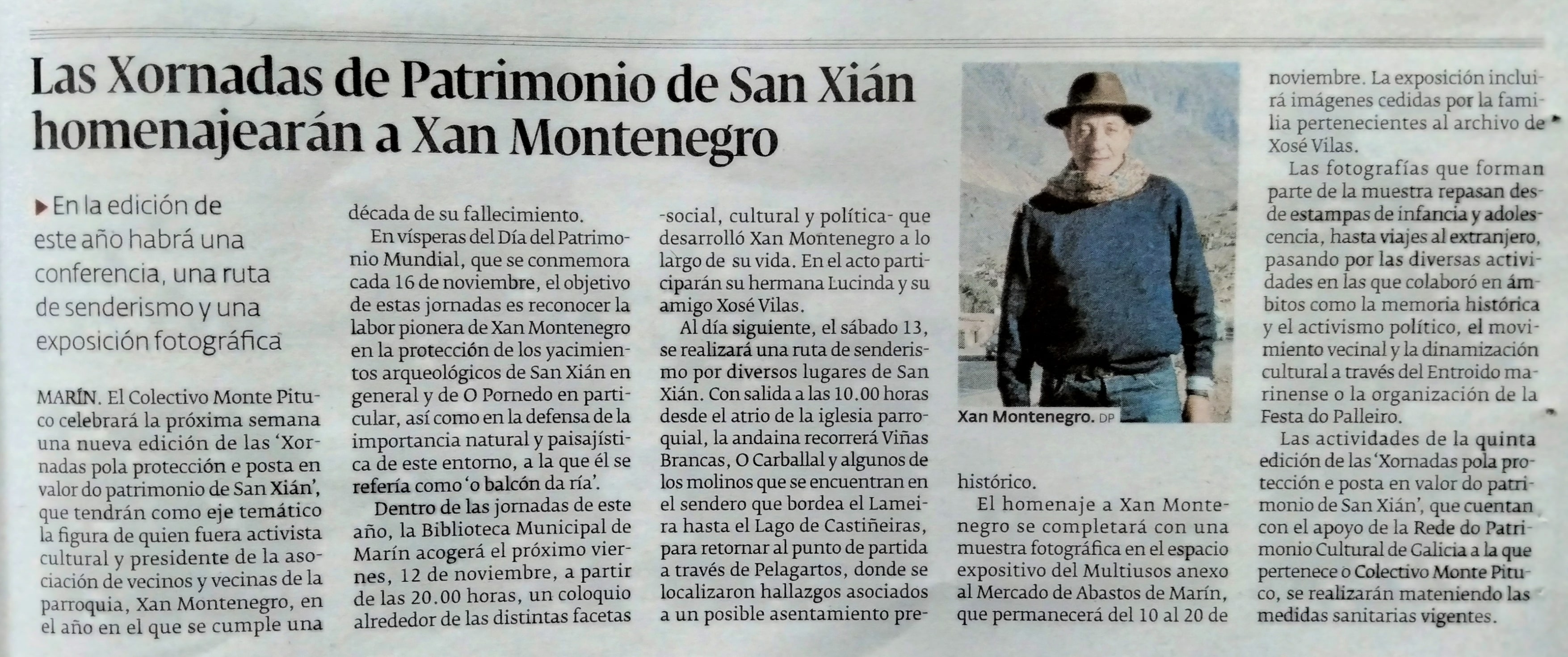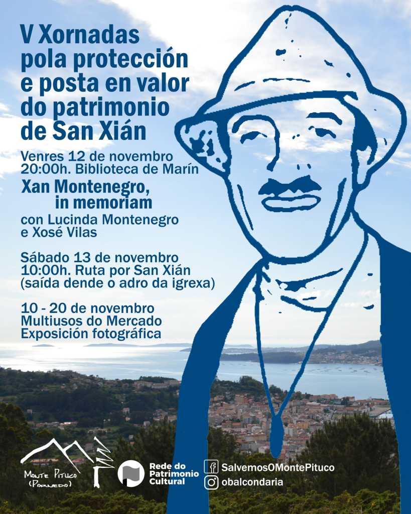 O Colectivo Monte Pituco (Pornedo) celebrará as V Xornadas pola protección e posta en valor do patrimonio de San Xián, que terán como eixe temático a figura de quen fora activista cultural e presidente da Asociación de Veciñas e Veciños da parroquia, Xan Montenegro, no ano no que se cumpriu unha década do seu pasamento. En vésperas do Día do Patrimonio Mundial, que se conmemora cada 16 de novembro, o obxectivo destas xornadas é recoñecer o labor pioneiro de Xan Montenegro na protección dos xacementos arqueolóxicos de San Xián en xeral e do Pornedo en particular, así como na defensa da importancia natural e paisaxística desta contorna, á que se refería como “o balcón da ría”.