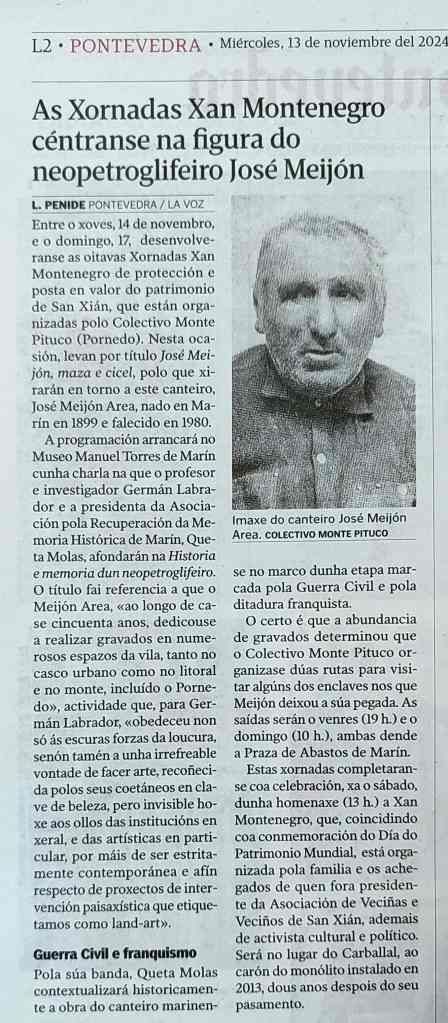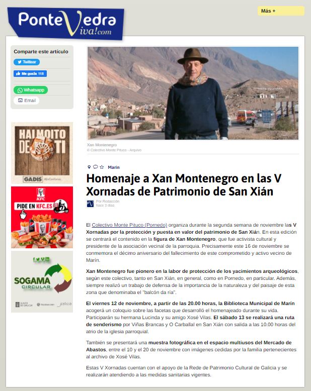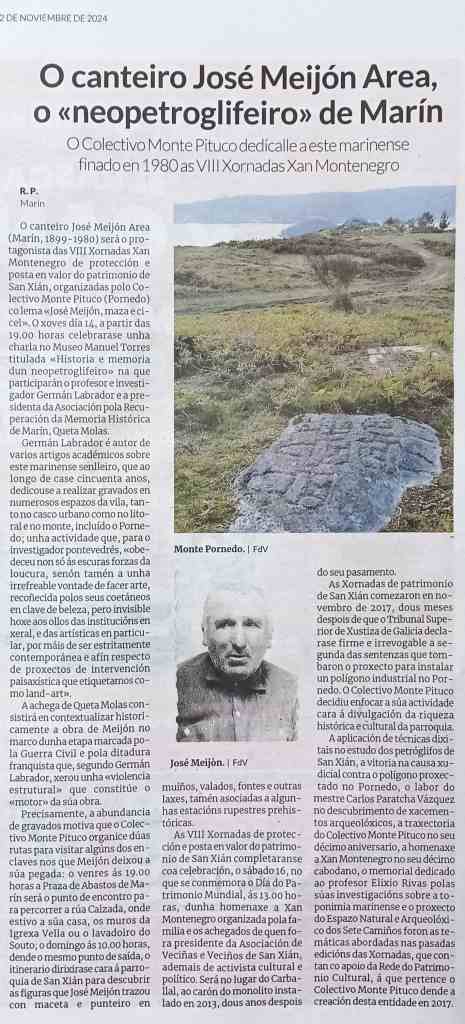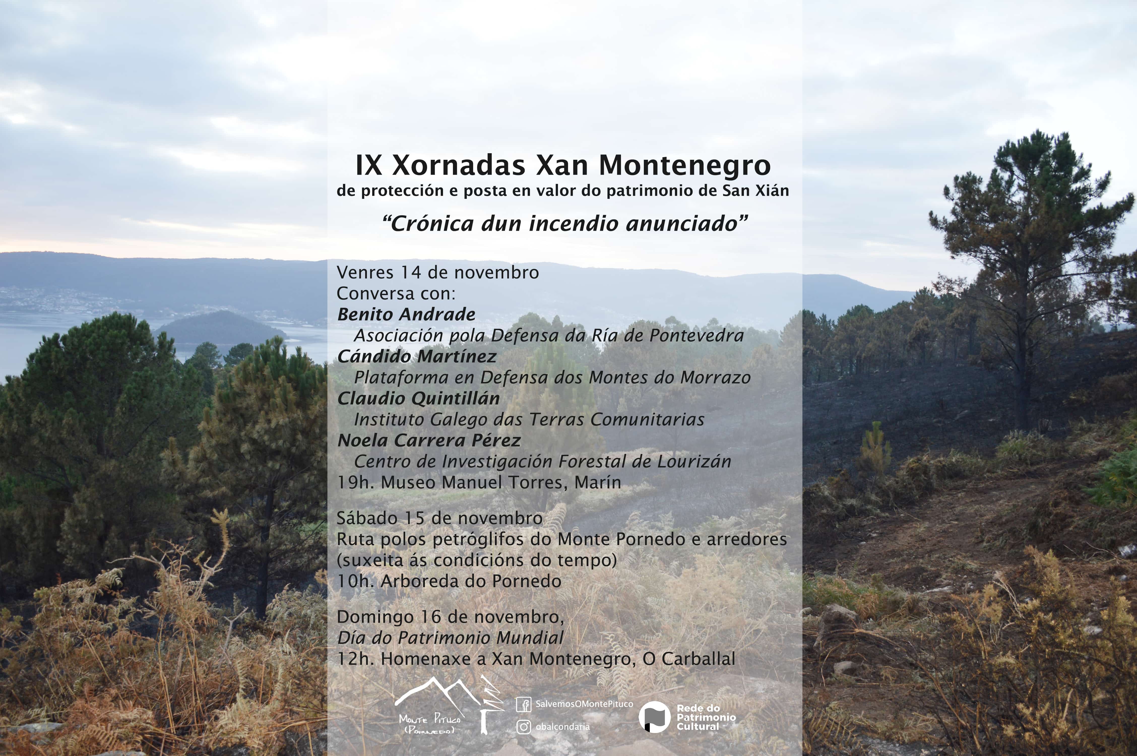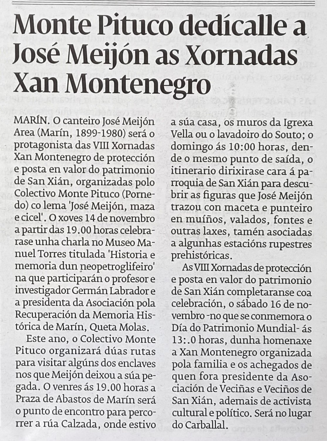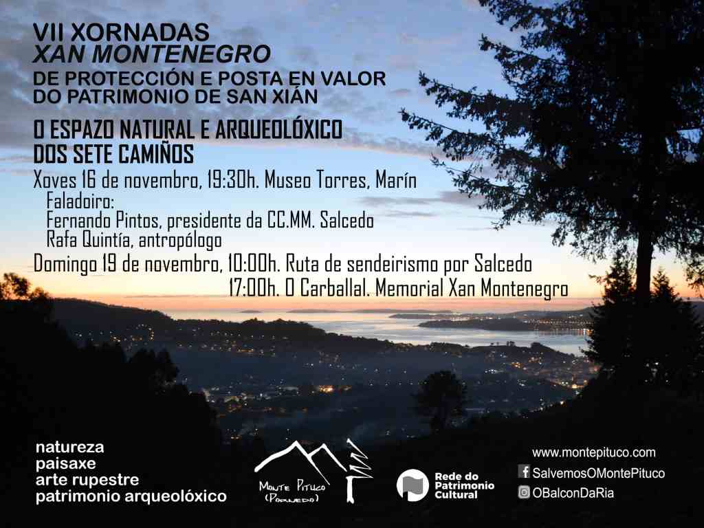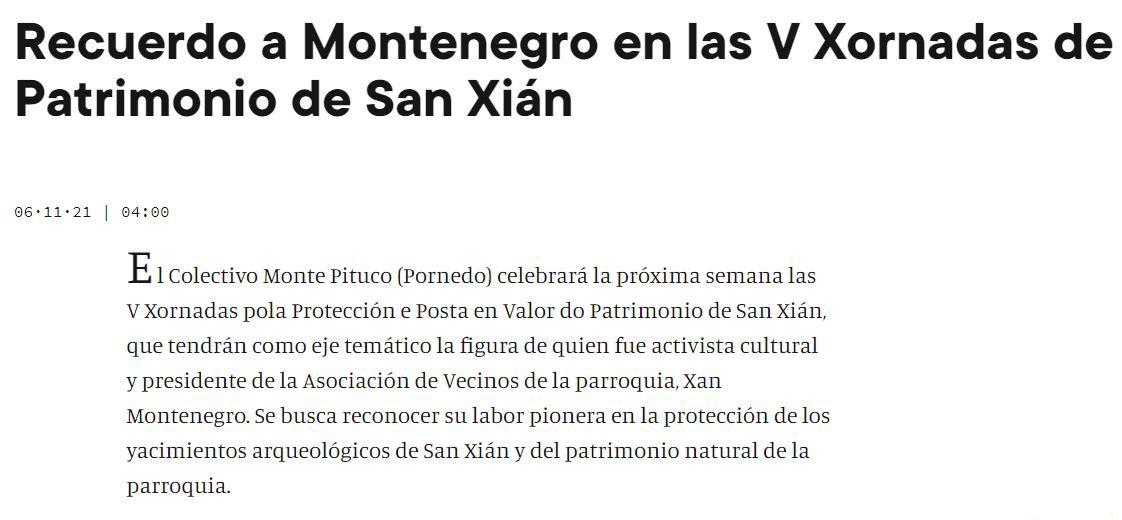 O Colectivo Monte Pituco (Pornedo) celebrará as V Xornadas pola protección e posta en valor do patrimonio de San Xián, que terán como eixe temático a figura de quen fora activista cultural e presidente da Asociación de Veciñas e Veciños da parroquia, Xan Montenegro, no ano no que se cumpriu unha década do seu pasamento. En vésperas do Día do Patrimonio Mundial, que se conmemora cada 16 de novembro, o obxectivo destas xornadas é recoñecer o labor pioneiro de Xan Montenegro na protección dos xacementos arqueolóxicos de San Xián en xeral e do Pornedo en particular, así como na defensa da importancia natural e paisaxística desta contorna, á que se refería como “o balcón da ría”.