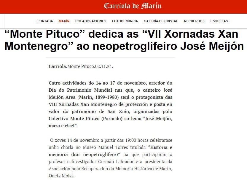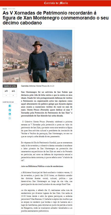 Diario de Pontevedra, 6 de novembro de 2021La Voz de Pontevedra, 7 de novembro de 2021Pontevedraviva, 5 novembro 2021Faro de Vigo, 6 novembro 2021Carriola, 6 novembro 2021Cousas, 6 novembro 2021