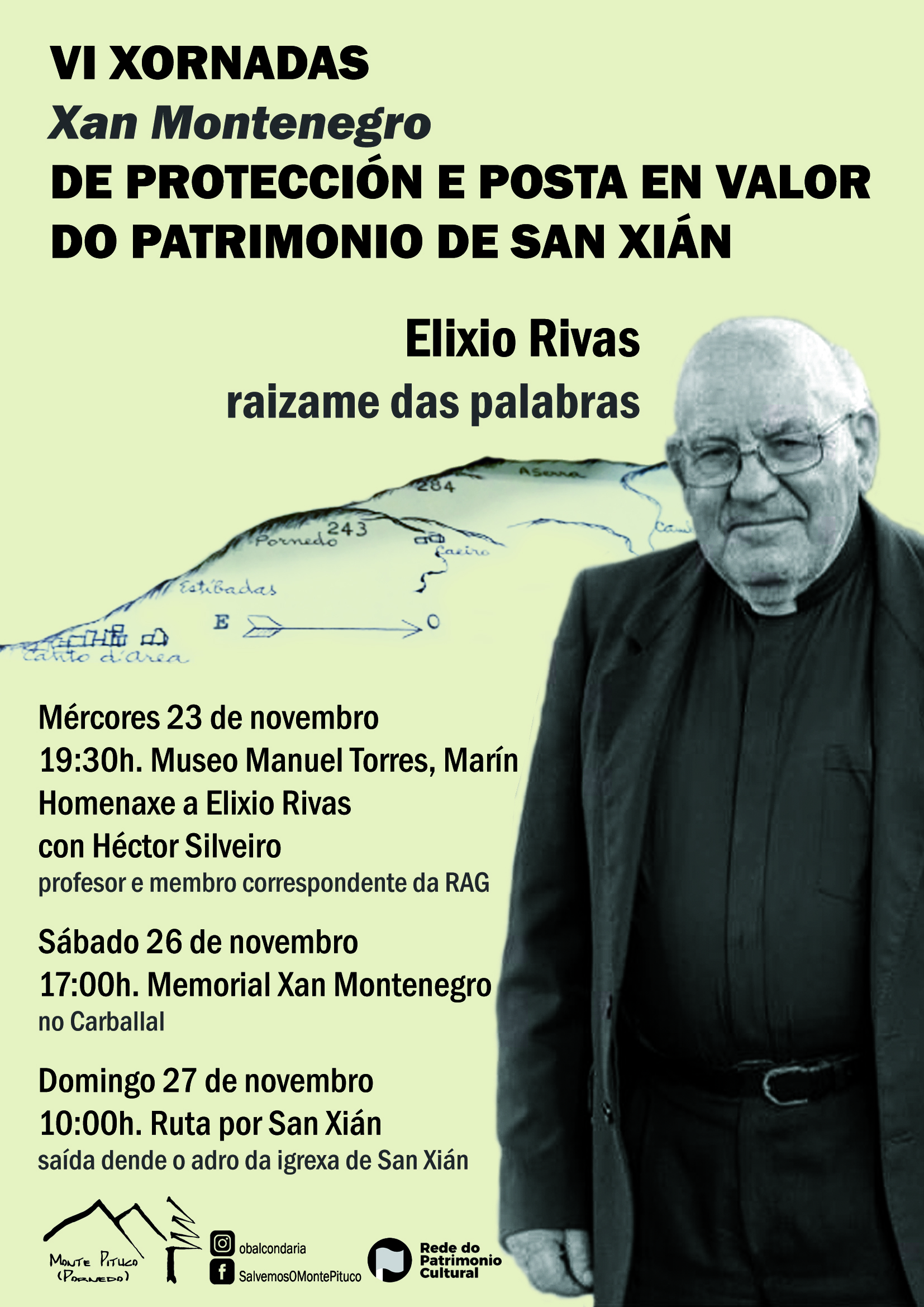 Na semana na que vén de celebrarse o Día Mundial do Patrimonio, o Colectivo Monte Pituco (Pornedo) anuncia as VI Xornadas “Xan Montenegro” de protección e posta en valor do patrimonio de San Xián, que se celebrarán os días 23, 26 e 27 de novembro. “Elixio Rivas, raizame das palabras” é o lema do programa de actividades, nas que se vai homenaxear o autor -falecido o pasado mes de setembro aos 97 anos- da obra “Toponimia de Marín.