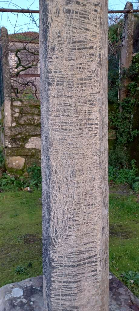 Precisamente, o primeiro elemento que se visitará este domingo será o cruceiro do Igrexario de San Xián que, nos últimos meses, resultou agredido. O fuste presenta marcas profundas realizadas cun material metálico, posiblemente unha radial, acaso coa intención de limpar a superficie da pedra. Lonxe de lograr ese obxectivo, semellante neglixencia provocou un dano considerable no varal do cruceiro, co risco para a integridade da peza.