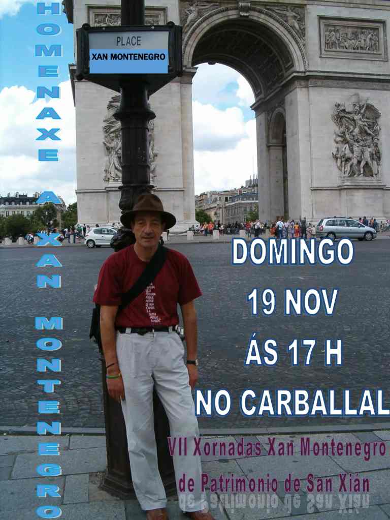 As VI Xornadas de protección e posta en valor do patrimonio de San Xián continuarán o sábado día 26 co Memorial Xan Montenegro, ás 17:00 horas no lugar do Carballal. A figura de quen fora activista cultural e presidente da Asociación de Veciñas e Veciños de San Xián dálle nome a estas xornadas dende a pasada edición como recoñecemento á súa contribución na mellora da parroquia. Familiares e amigos de Xan Montenegro veñen impulsando esta homenaxe cívica dende o seu pasamento, en xuño de 2011.