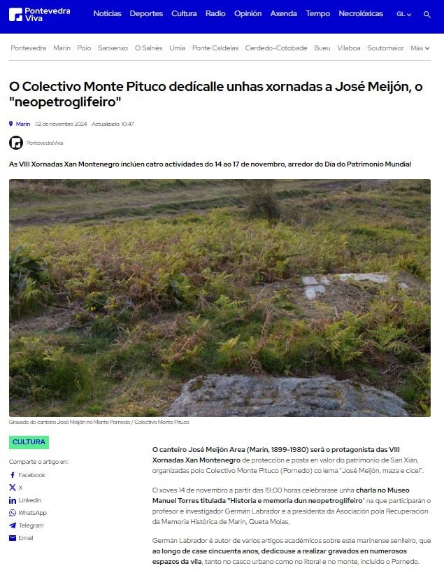 Ante o decepcionante resultado da visita aos petróglifos de San Xián organizada polo Concello de Marín, dende o Colectivo Monte Pituco reclamamos colaboración entre a Administración local e a Comunidade de Montes, xunto cos organismos competentes a nivel autonómico, para a limpeza e posta en valor dos xacementos; o desenvolvemento do Plan de Protección do Patrimonio coas achegas reiteradamente demandadas dende este grupo veciñal; e a implicación dos colectivos en defensa do patrimonio arqueolóxico nas futuras visitas como coñecedores da ubicación dos gravados -tanto os historicamente catalogados como os de recente descubrimento- e da rede de camiños que os comunican.