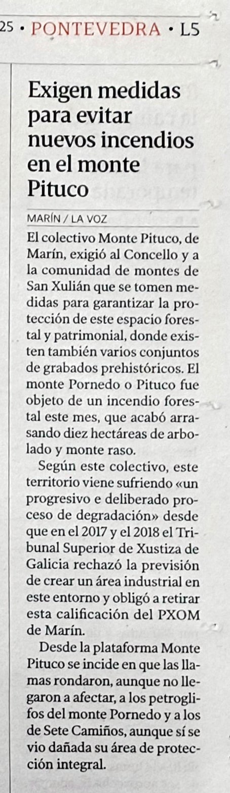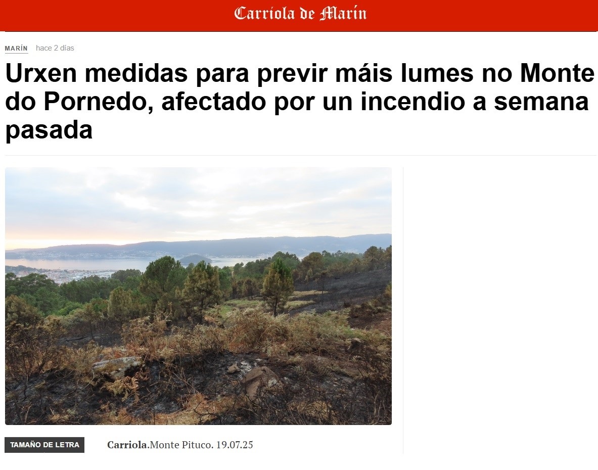 Por outra banda, Luita Verde lamenta o dano provocado polos incendios forestais no Monte do Pornedo, do 7 de xullo, e entre A Moreira e o Monte Penizas, do 27 de xullo, no Concello de Marín, mais salienta que unha grande parte das parcelas afectadas por estes incendios forestais están en propiedade precisamente desta Comunidade de Montes Veciñais de San Xulián, que destaca por telo seu monte inzado de monocultivos con especies pirófitas (eucaliptos e piñeiros), cunha inadecuada ou nalgúns casos inexistente silvicultura preventiva e que incumpre a xestión da biomasa nas redes de faixas que lle compete por non falar da falta de protección do patrimonio cultural, do que lembramos que esta comunidade de montes veciñais é a mesma propietaria da parcela onde durante anos permitiu a presenza dunha entulleira sobre o Ben de Interese Cultural do petróglifo da Moreira, denunciado por este colectivo ecoloxista en marzo do 2019, que posteriormente tivo a comunidade de montes que restaurar e que onte parece que, afortunadamente, non foi afectado directamente polo incendio forestal.
