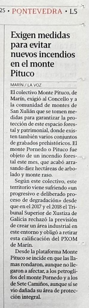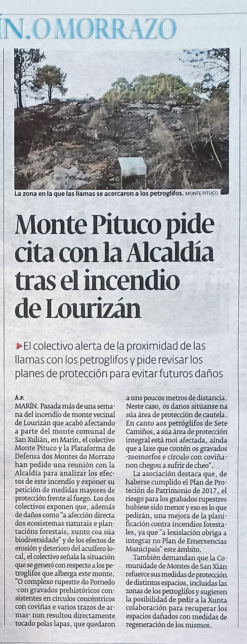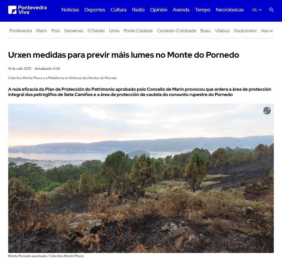 O monte Pornedo, ou Pituco, ardeu o pasado 7 de xullo; vinte días despois, tamén o monte da Moreira e Penizas. O 1 de agosto mantivemos unha xuntanza coa alcaldesa María Ramallo e co concelleiro de Urbanismo Manuel Santos para compartirlles un balance -documentado graficamente- da pegada do lume no ‘balcón da ría’ e nos xacementos arqueolóxicos do Pornedo e de Sete Camiños. Naquel encontro reclamouse que o Concello de Marín asumira as súas responsabilidades activando o “Plan municipal de prevención e defensa contra os incendios”, integrado no “Plan de emerxencias municipais”. Tamén se pediu información sobre a situación na que está o “Plan de protección do patrimonio” aprobado en 2017, do que agardamos recibir información sobre as medidas concretas que contempla, a súa dotación orzamentaria e o seguemento que se estea facendo sobre as accións e os prazos fixados para a súa aplicación.