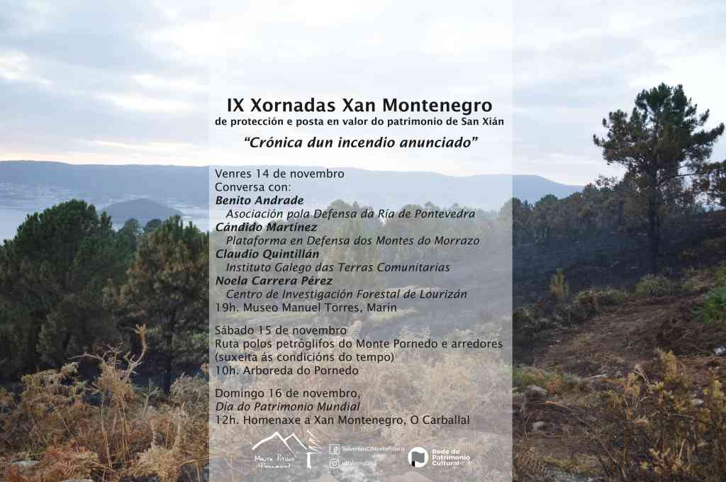 Os participantes neste coloquio analizarán, no plano local, a situación do monte antes e despois dos lumes, mais tamén -a nivel xeral- as perspectivas de futuro dos incendios en relación ao Plano Forestal, e ata experiencias encamiñadas a minimizar o impacto das lapas. As Xornadas de Patrimonio de San Xián renovan así, un ano máis, o seu compromiso coa defensa e promoción do medio natural e dos bens culturais que atesoura a parroquia: os incendios deste verán non só arrasaron algo máis de dez hectáreas no Pornedo -ou Pituco- e outra hectárea máis en Penizas; tamén afectaron a área de protección de cautela do conxunto rupestre do Pornedo e a área de protección integral dos petróglifos de Sete Camiños.