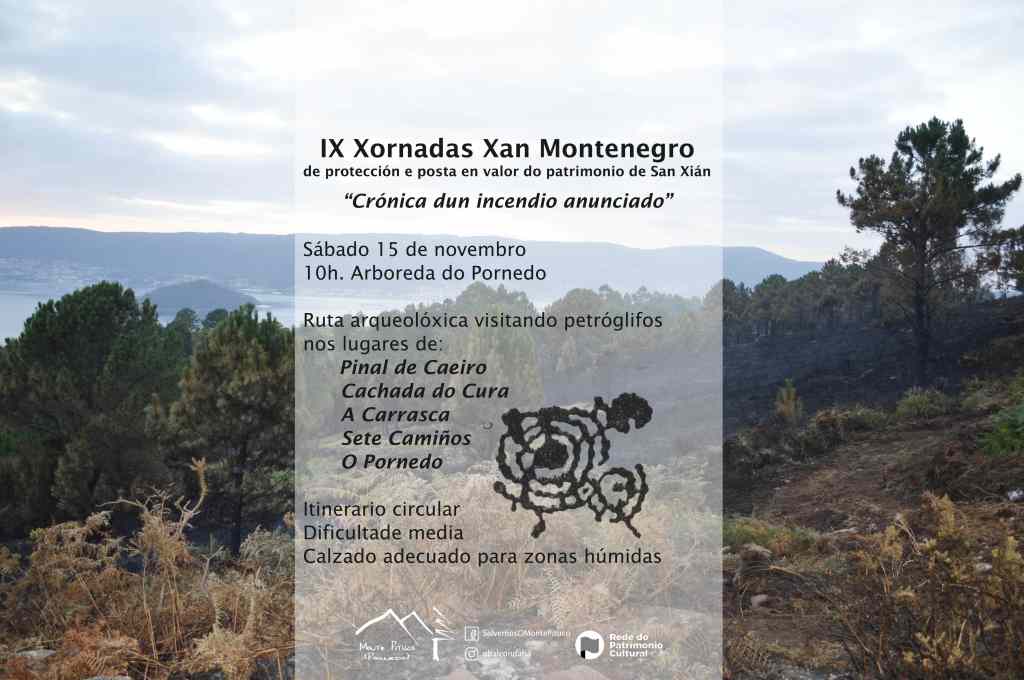 As IX Xornadas Xan Montenegro de protección e posta en valor do patrimonio de San Xián concluirán mañá sábado, 22 de novembro, cunha ruta arqueolóxica que sairá ás 10:00 horas dende a arboreda do Pornedo. Organizada polo Colectivo Monte Pituco, percorrerá os xacementos rupestres situados nos lugares de Pinal de Caeiro, Cachada do Cura, A Carrasca, Sete Camiños e O Pornedo. Durante o itinerario, de trazado circular e dificultade media, tamén se comentarán aspectos da flora, da fauna e do interese paisaxístico da contorna. Pola presenza de diversos regatos, brañas e nacementos de auga, cómpre que as persoas participantes dispoñan de calzado axeitado para as condicións do terreo.