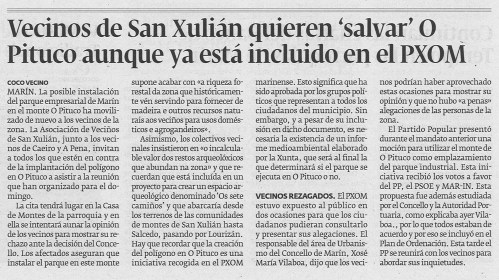 Certamente, temos que recoñecer a nosa posición “rezagada”, como a califican no Diario de Pontevedra, con respecto a outros movementos veciñais xurdidos nos últimos meses para opoñerse á construcción de chan industrial en terreos que perxudicaban aos veciños da zona. Facemos autocrítica; é un sano exercicio recoñecer os erros propios. Os habitantes de Caeiro e da Pena, como os de San Xulián por extensión, e os doutras parroquias do rural marinense, estabamos centrados en alegar por partida dobre contra as restriccións que marcaba o proxecto de PXOM nas propiedades particulares de cada un, que eran moitas e das que aínda se agarda resposta.