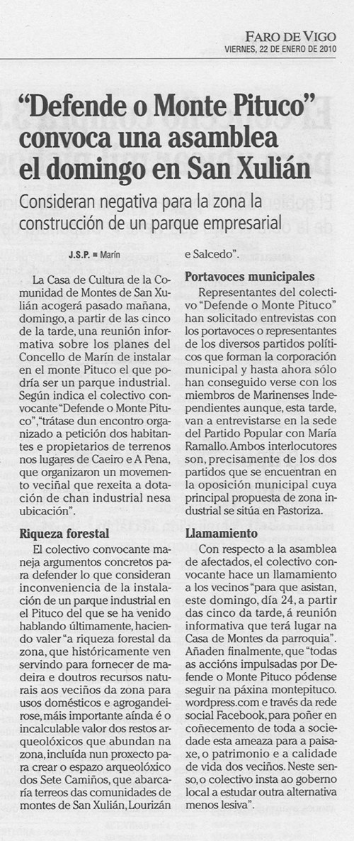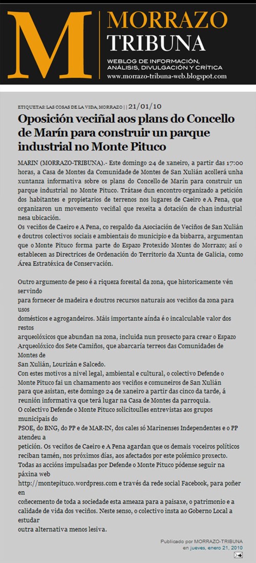 Grazas aos medios informativos: Faro de Vigo, La Voz de Galicia, Diario de Pontevedra, Radio Voz, Tribuna do Morrazo, TVG… por dárenlle difusión a DEFENDE O MONTE PITUCO.
