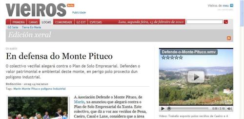 A problemática encol do Monte Pituco e o proxecto para construir nel unha Plataforma Loxística, polígono industrial ou como lle queiran chamar á posible desfeita que se cerne sobre este territorio natural, xa circula nos medios de comunicación, non só locais, senón de ámbito galego. Traemos a esta páxina a difusión que deste conflicto fai Vieiros, onde figuran varios comentarios de apoio por parte dos internautas. Moitísimas grazas.