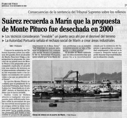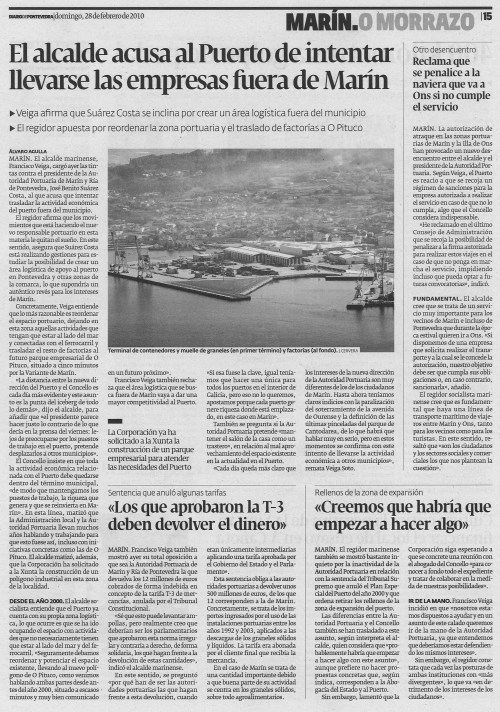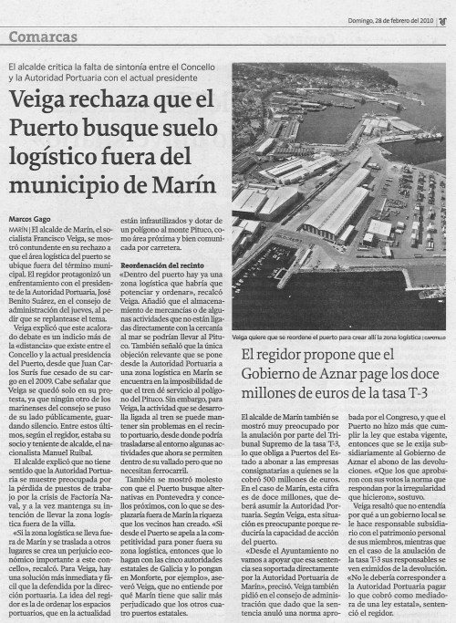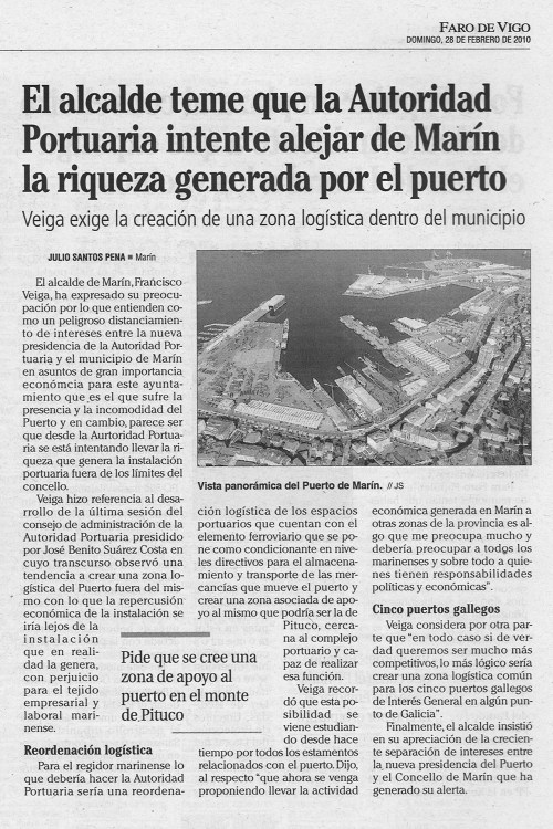 “…Don Francisco “el Desdichado” aprovechó que en la última reunión del consejo de administración del Puerto no estaba el alcalde de Pontevedra para criticar que este organismo quiera llevar, según él, la zona logística a la capital. De una vez por todas alguien le tiene que poner en su sitio a este personaje y ya que ni el pueblo ni la oposición lo hacen quizás la iniciativa debiera partir de su propio partido, porque este sujeto nos lleva a la ruina. Primero, porque no hay necesidad de enfrentamientos estériles y segundo porque está dinamitando el buen nombre de Marín ante otras instituciones amén de impedir el progreso de la ciudad.