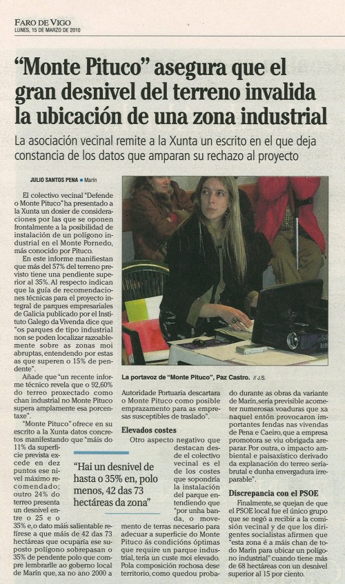 Unha obra que arruinaría os bens naturais e patrimoniais deste espazo protexido, que provocaría unha transformación brutal da paisaxe e riscos graves para a poboación e as propiedades afectadas pola pendente excesiva do terreo. Agustín Hernández dixo que a Xunta estudaría a instalación dun polígono industrial entre Marín e Moaña. E con respecto á plataforma loxística, que a súa ubicación ía depender do estudo de avaliación ambiental. Por iso o informe de DEFENDE O MONTE PITUCO basea nese aspecto a inviabilidade do proxecto.