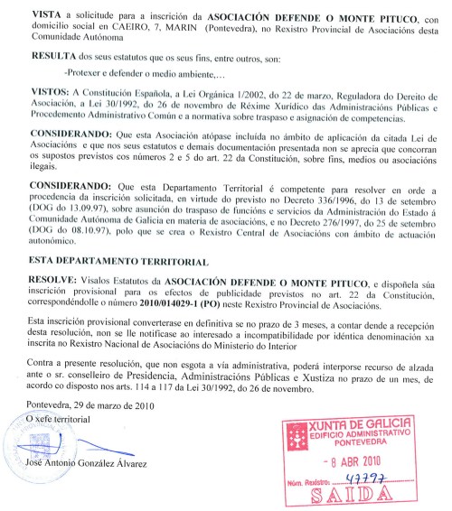 Estes 100 artigos cadran cunha boa nova. DEFENDE O MONTE PITUCO xa visou os estatutos da Asociación creada para respaldar todas as accións que emprendamos; xa figuramos provisionalmente no Rexistro Provincial de Asociacións. E dentro de tres meses esta inscrición será definitiva.