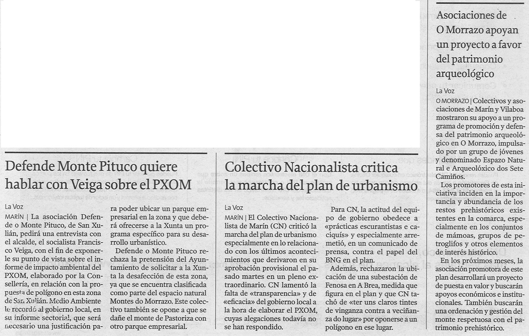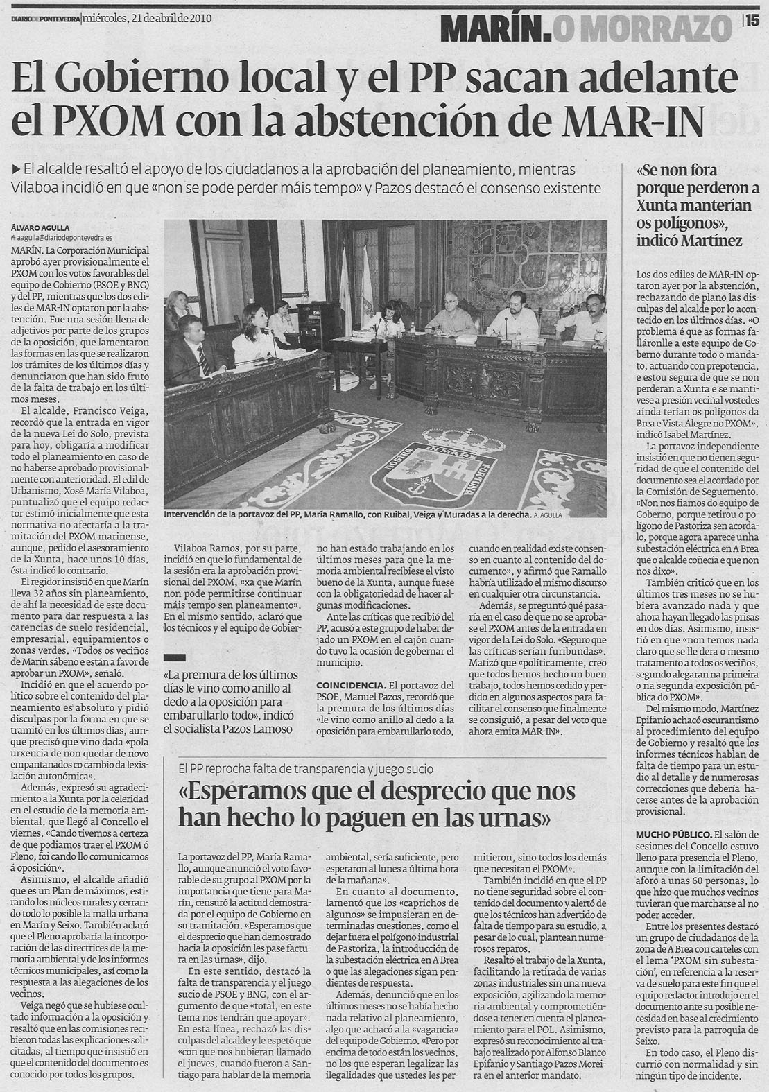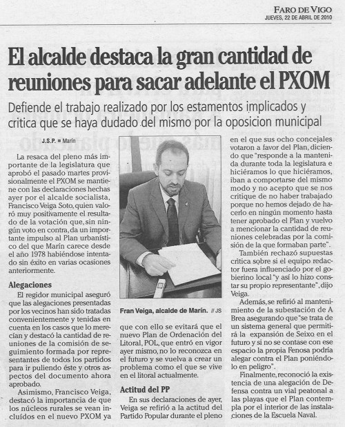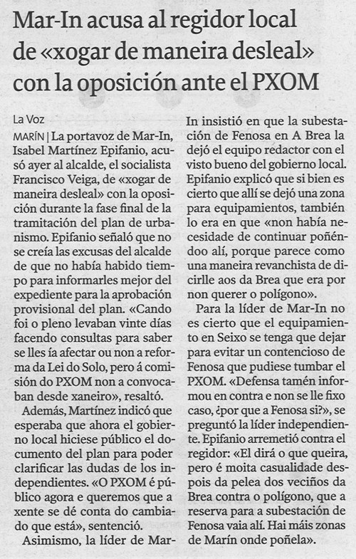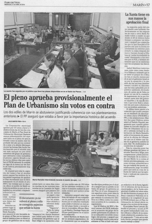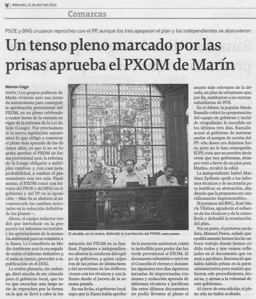 Si los politicos que rigen en Marín fueran coherentes con lo que predican hace mucho tiempo que habría un plan general de ordenación en Marín. Lo que critico es que despues de presentarse 4.000 alegaciones, 400 o 40, no se les haya contestado ni a una antes de ser aprobado. El mayor problema del equipo redactor no fueron las alegaciones o los impedimentos de otros organismos. El mayor problema es los vaivenes del grupo de gobierno que con un llamada de telefono o una “reunión de coordinación” le pega una vuelta y media a un documento técnico. El informe de la anterior COTOP de 2006 sobre el Pxom no deja títere con cabeza: http://www.cptopt.xunta.es/portal/webdav/site/cptopv/shared/es/pdfs/dxu/RESOLUCIONS%20PLANS%20URBANISMO/INFORME%20PREVIO_PLAN%20XERAL_MARIN.pdf