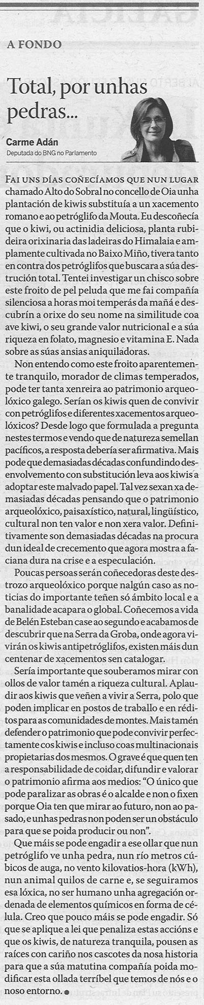«…O grave é que quen ten a responsabilidade de coidar, difundir e valorar o patrimonio afirma aos medios: “O único que pode paralizar as obras é o alcalde e non o fixen porque Oia ten que mirar ao futuro, non ao pasado, e unhas pedras non poden ser un obstáculo para que se poida producir ou non”».