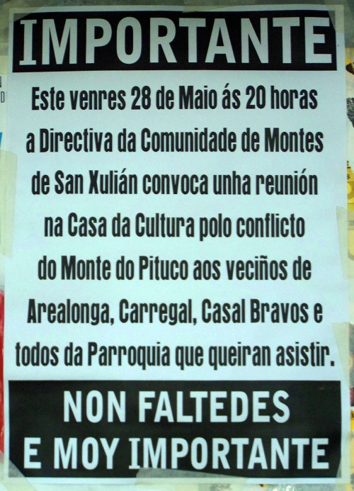 Cando vimos este cartel, lembramos que hai un grupo en Facebook que se denomina «“Haber se quedamos…” A ver se aprendes a escribir». Pero imos deixar á marxe a horripilante falta de ortografía, a torpeza redactando anuncios e a confusión á que induce o citado “conflicto” no Monte Pituco, que nada ten que ver co proxecto de polígono industrial. O caso é que a Comunidade de Montes de San Xulián ten un litixio co propietario dunha parcela privada. Este particular, supostamente, incrementou a superficie da súa finca cun anaco de terreo comunal que a Xunta de Montes lle reclama.
