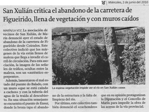 Velaquí o estado que presentan as cunetas nos lugares de Bouza, Caeiro e Pena: tralas chuvias abundantes dos últimos meses e a chegada do bo tempo, a maleza invade o paso dos peóns nunha estrada de titularidade provincial cun trazado cheo de curvas e que carece de beirarrúas. Sen beirarrúas, cunha iluminación tirando a precaria e unhas condicións de seguridade vial cuestionables. Os habitantes da zona e os numerosos paseantes que soben camiñando a cotío ata o alto do Pituco, por moi guiadiños que vaian “pola súa man”, non poden evitar ás veces ter que botarse contra o muro para que algúns conductores desaprensivos, que circulan tal coma nos rallies, non os leven por diante. Cativos e persoas maiores escasas de reflexos, corredores e ciclistas que fan este roteiro para entrenar, expóñense a un perigo innecesario que se podería resolver se a maquinaria da Deputación fixera limpeza nestes tramos, se o Concello de Marín demandara que os viais que comunican as parroquias estiveran nas mellores condicións posibles. Cómpre tamén sensibilizar os donos das fincas e dos matos lindantes para que se preocupen de desbrozar as súas propiedades; unha colaboración que xa aportan algúns veciños, de xeito responsable e exemplar.