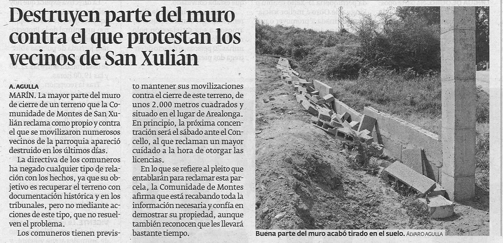 Derrumbar ese muro é un acto de violencia, non de xustiza. Derrumbar ese muro pola forza non é un acto de valentía, senón de nocturnidade, premeditación e alevosía. Derrumbar ese muro non só non arranxa o conflicto, senón que o agrava porque pode acarrear responsabilidades de maior calado xurídico. Derrumbar ese muro non é defender o Monte Pituco, é abocar o Monte Pituco a unha longa sucesión de querelas e pleitos, de acusacións cruzadas que desgastarán máis aínda a precaria economía da Comunidade de Montes. Derrumbar ese muro non é defender o Monte Pituco, porque o Monte Pituco deféndese limpamente por si só, pola sensatez dos seus veciños e, chegado o extremo, ante as institucións públicas ou pacificamente na rúa. Por eso, a xunta rectora da Comunidade de Montes está na obriga de facer que non se cometan actos vandálicos que perxudican a imaxe desta parroquia e que obstaculizan a acción da xustiza. Que a Comunidade de Montes se adique a buscar a documentación que precisa para demostrar de xeito irrefutable a titularidade comunal dese terreo. Que atope os documentos que os propios directivos recoñeceron na última asemblea xeral que teñen extraviados ou en poder de antigos dirixentes. Que espabilen, que isto ten pinta de ir para longo.