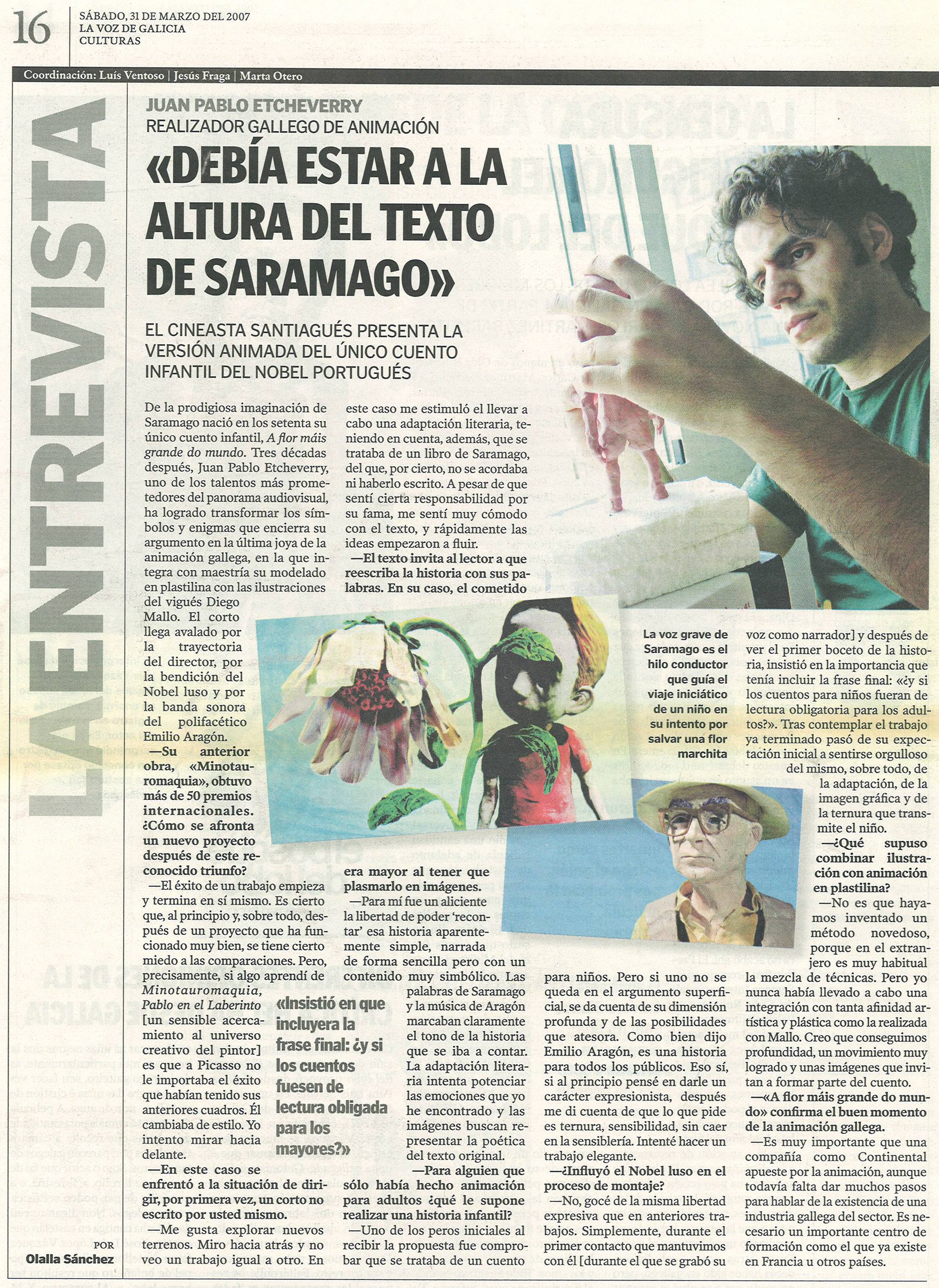 …Oh, que grata e inesperada sorpresa-casualidade! Facendo arqueoloxía documental, na procura doutro artigo, atopamos unha entrevista ao realizador deste corto de animación, Juan Pablo Etxeberry. Falando da participación de Saramago na producción desta película, destaca o seguinte:
