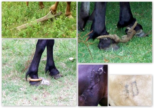 Todas as palabras son poucas para criticar e denunciar a situación dos cabalos ceibes que percorren os montes de San Xulián, no límite con Lourizán e con Salcedo. Eguas, principalmente, cuxas patas están trabadas, limitadas, atadas, prendidas, feridas e lesionadas porque os seus donos as condean a levar permanentemente estes tinglados de tortura que cercenan a súa mobilidade.