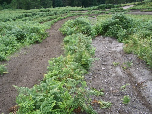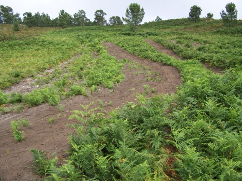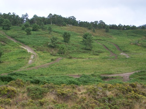 Terra estéril, seca e chea de gretas onde as rodas xa deixaron de pasar. Terra trillada e poirenta, ondulacións no terreo e pronunciados desniveis onde os pilotos por deciden guiar os vehículos. Porque aínda por riba, dispoñen do monte ao seu antollo: cando cansan de repetir un trazado, fan outro ao carón, convertindo a ladeira nun labirinto de camiños a ningunha parte.