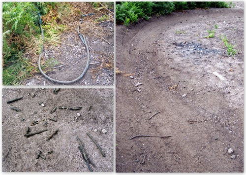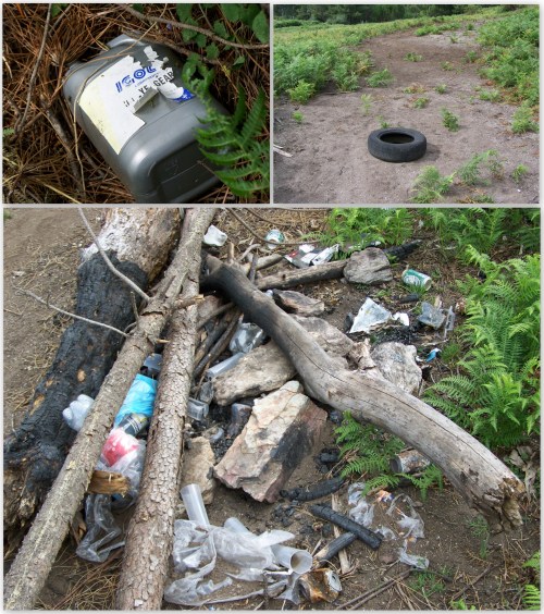 Isto é gamberrismo puro e duro, porque teñen o punto de encontro sementado de botellas de cristal, latas e envases de plástico. Tampouco dubidan en abandoar neumáticos usados, pezas de goma e outros artiluxios que se desprenden das máquinas. E para rubricar o colmo do vandalismo, os restos dunha enorme fogata-basureiro da que aínda quedan restos. Non só é contaminante, senón potencialmente perigoso en caso de incendio, ao tratarse de material inflamable ou que, no caso do vidro, podería actuar de lupa.