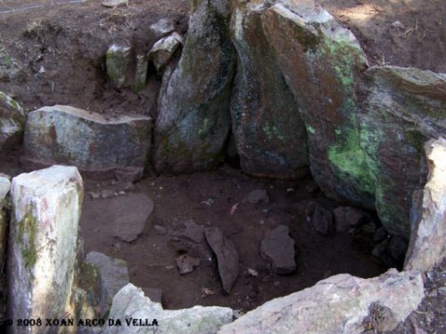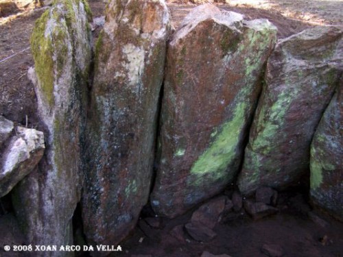 “Pertence ó concello de Marín (Pontevedra) aínda que está no límite co de Vilaboa. Conserva unha cámara poligonal cun corredor incipiente que se estreita progresivamente ata acadar os 50 cm de anchura na entrada. Entre os esteos da cámara poden verse unhas cuñas de pedra que evitan o aumento da presión dos soportes cara a dentro. Actualmente ten unha tampa da que non pode deducirse se é a orixinal ou si se trata dun engadido de semellantes características”.