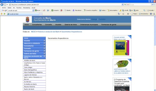 É unha vergoña que un concello como o de Marín teña semellante escaparate virtual: incompleto, chafalleiro, cheo de lagoas informativas. Trala decepción, reorientamos a busca e damos con outra pestana: “lugares de interese”. E velaí a escueta lista de propostas que ofrece aos visitantes: os petroglifos de Mogor, as igrexas, o casco antigo (¿?), praias, miradoiros (lago de Castiñeiras), carballeiras (¿?), illas (¿? cita a de Tambo, pero é que resulta que este enclave pertence ao termo municipal de Poio), porto, lago de Castiñeiras (…repetido!). E máis nada? Dende logo, á parte de que clama ao ceo a imprecisión, dá unha lamentable impresión de vaguedade, de relación feita á présa e correndo, sen criterio. Nula profesionalidade.