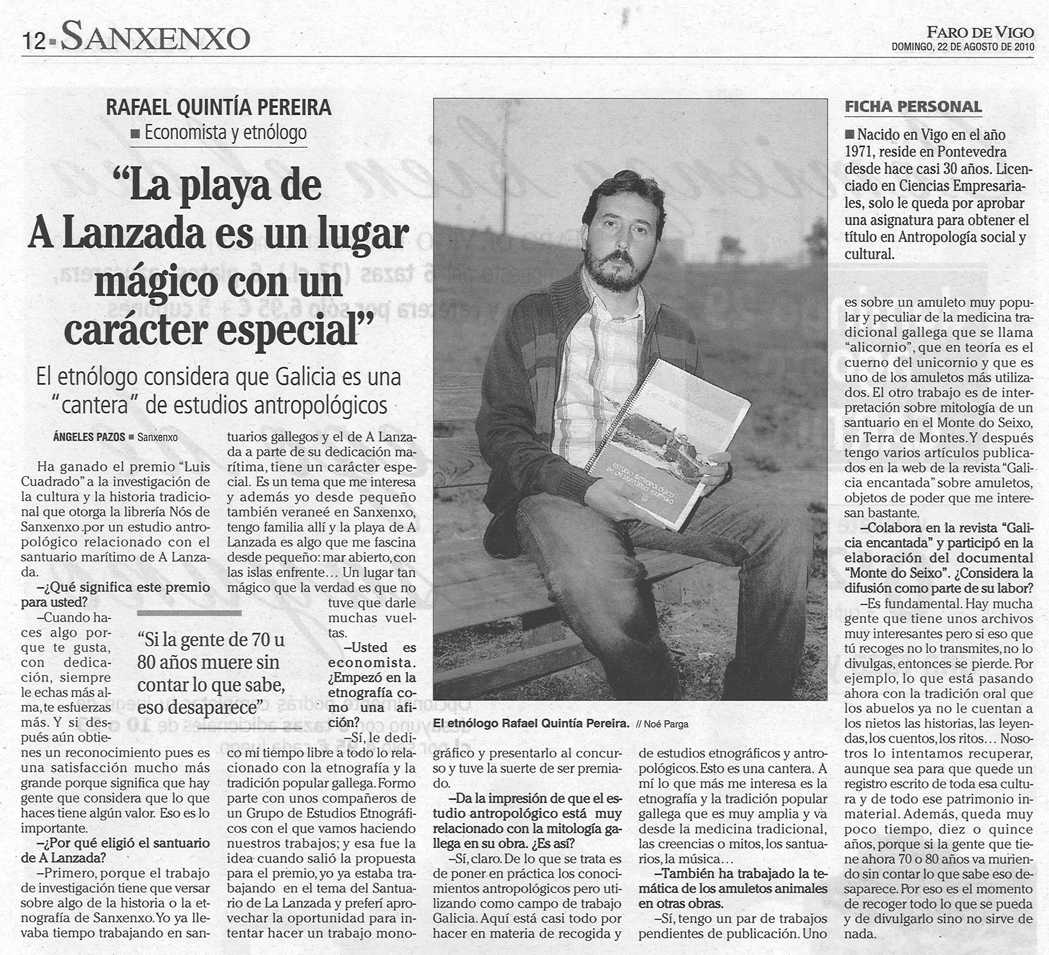 Premio Luis Cuadrado de investigación da cultura e da historia tradicional, convocado pola libraría Nós de Sanxenxo, co traballo titulado “Estudo Antropolóxico dun Santuario Marítimo”, adicado ao santuario da Lanzada.
