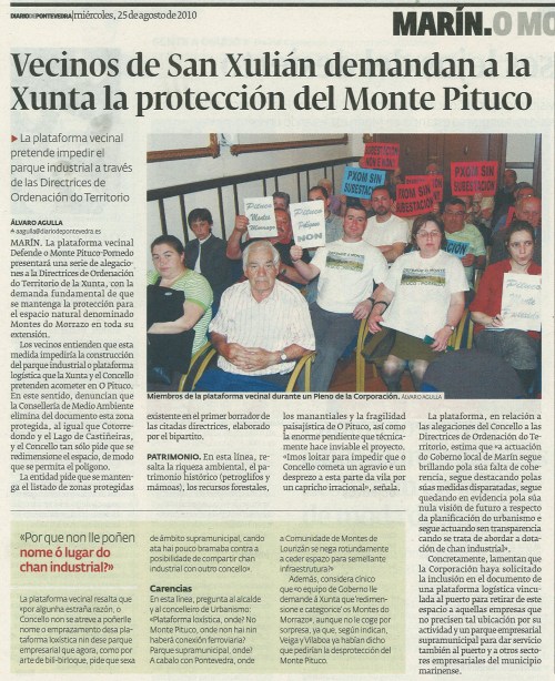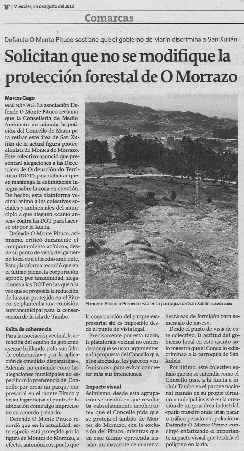 As noticias publicadas onte na prensa local a respecto da protección ambiental que este colectivo demanda para o Monte Pituco (Pornedo) reflicten que este blog, por si mesmo e sen que se tivera emitido ningún comunicado expreso, é fonte de información para os medios. Matizar, en todo caso, que DEFENDE O MONTE PITUCO (PORNEDO) xa presentou a pasada semana as alegacións pertinentes en demanda de PROTECCIÓN INTEGRAL PARA OS MONTES DO MORRAZO.