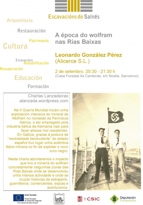 Trala visita, que terá unha duración aproximada dunha hora, haberá unha charla sobre a febre do wolfram durante os anos 40 en Galicia, impartida por Leonardo González Pérez (Alicerce SL). A imaxe do cartel na que aparece un submarino nazi, foi tomada no porto de Marín na II Guerra Mundial (foto do arquivo familiar de Jorge García).