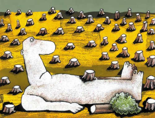 Estamos abocados ao ermo forestal, se non conseguimos virar as tornas. O bosque autóctono xa retrocedeu de máis; era o seu ir recuperando para piñeiros, carballos e castiñeiros o espazo que dende hai décadas foron gañando eucaliptos e acacias. Esta viñeta de Tomás Rodríguez Zayas ‘Tomy’, que gañou o Premio Curuxa de humor gráfico e que permanece exposta no Museo do Humor de Fene, advírtenos que a deforestación é un problema ecolóxico e social, que non se debe consentir a tala de grandes superficies naturais a calquera prezo. Non nos cabe na cabeza semellante deserto desolador no Monte Pituco (Pornedo), creando un antiestético baleiro visual en pleno saco da ría, sustituindo o verde das masas arbóreas polo gris do formigón e do asfalto ao longo de hectáreas e máis hectáreas de terreo.