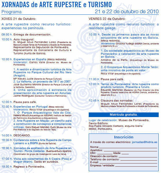 …Sen pasar por alto todas estas críticas ao Concello de Marín, o programa das I Xornadas de Arte Rupestre e Turismo semella completo e interesante. Vai haber unha visita aos petroglifos da Caeira (Poio) e de Mogor (Marín), e nas charlas van participar: