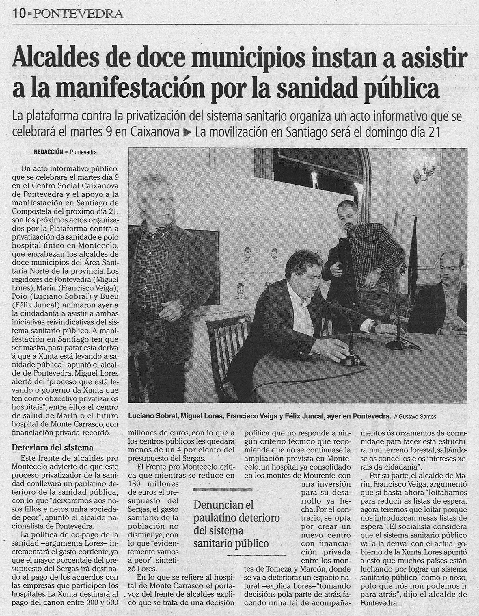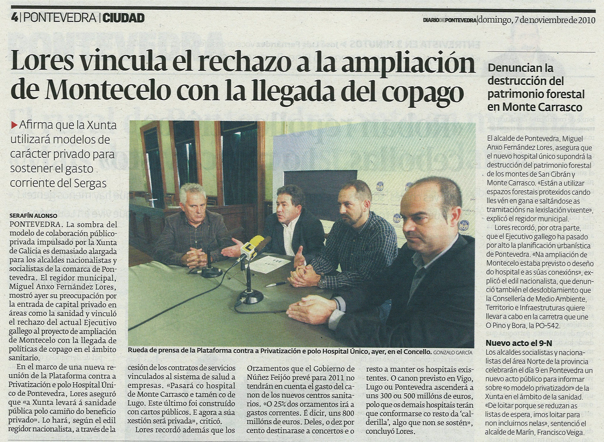 Con estas palabras, o alcalde de Pontevedra, Miguel Fernández Lores, expresaba a súa preocupación pola posible destrucción do patrimonio forestal das parroquias de Marcón e San Cibrán debido ao proxecto da Consellería de Sanidade de construir un novo hospital en Monte Carrasco. Un “cirio” no que tamén está enfrascado o alcalde de Marín, nunha nova fronte común do BNG e do PSOE contra o Goberno da Xunta.