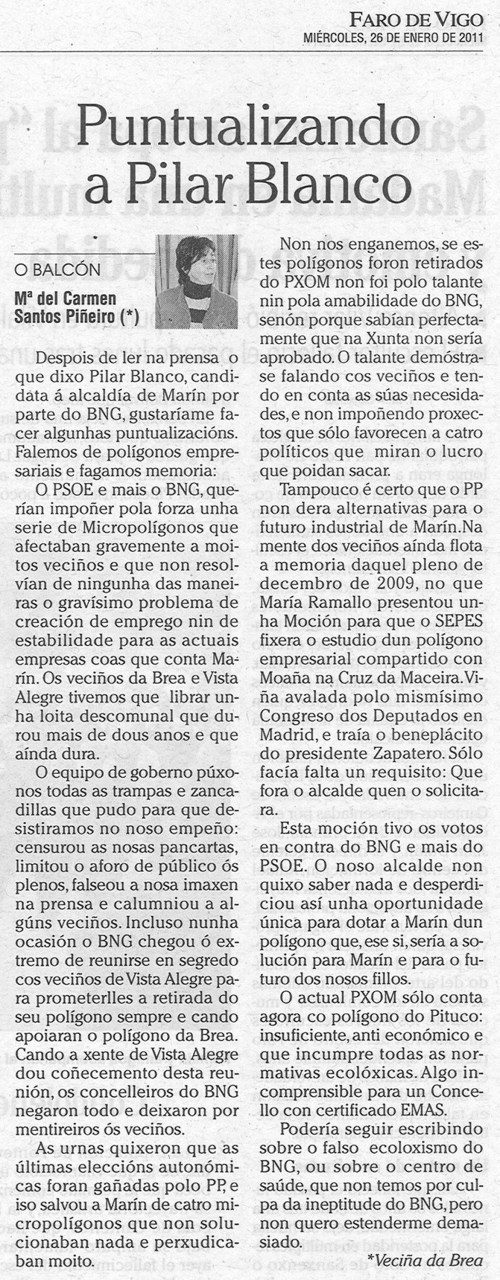 A pasada fin de semana publicouse unha entrevista coa concelleira de Medio Ambiente e próxima cabeza de lista do BNG á alcaldía de Marín, Pilar Blanco. Os seus comentarios sobre a xestión urbanística que desenvolveu o grupo municipal nacionalista neste mandato, especialmente no que respecta ao chan industrial, motivaron que unha veciña da Brea replicara de xeito contundente e firme as palabras de Pilar Blanco: