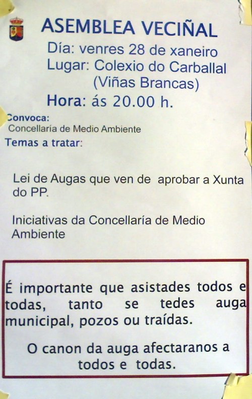 O BNG leva en campaña electoral subrepticia dende sempre, a conta dos seus propios socios de Goberno, e tamén a conta da oposición, principalmente o PP. O show máis recente vén a conta da Lei de Augas, que xa foi aprobada polo Parlamento. Polo tanto, as charlas que organiza nas parroquias son fachada de cartón pedra, papel mollado, ganas de envolver a veciñanza coa excusa de facerlle un favor que, en realidade, é unha perda inútil de tempo. Tócanos nesta ocasión aos habitantes da parroquia de San Xulián, que estamos convocados ás 8 da tarde de mañá venres para escoitar a saber que paranoias, explicadas de xeito requintado e grandilocuente, como lle corresponde ao BNG. E agardarán que lles deamos as grazas por abrirnos os ollos, por inundar de luz a nosa ignorancia, cando todo o mundo sabe que de “perdoavidas” o BNG non ten nada. Por iso, ollo-piollo, quen teña interese en asistir a esa xuntanza, porque o saber non ocupa lugar e porque toda información que se poida obter de primeira man é pouca, que vaia cos “deberes” feitos. Que non agarde ninguén a que o BNG llo conte á súa maneira, que acuda á fonte orixinal, que lea a Lei de Augas, que se pode descargar na seguinte ligazón, en formato PDF.