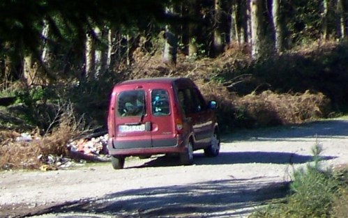 Nese percorrido polo monte tivemos ocasión de comprobar o mal estado no que se atopan as pistas e camiños a causa da recente riada e do mal estado de conservación no que estaban os regos. Pasou un coche e tivemos a oportunidade de fotografar as manobras que tivo que facer o condutor para esquivar as fochancas e evitar meter as rodas de onde non as puidera sacar. Grazas a ese impulso foi posible captar casualmente a furgoneta granate dese home (aínda que houbo que ampliar moito a imaxe). Porque, cando voltamos ao punto de inicio do percorrido, o vehículo xa non estaba e o boxer seguía vagando por alí, xusto onde fora abandoado, practicamente diante do noso fuciño.