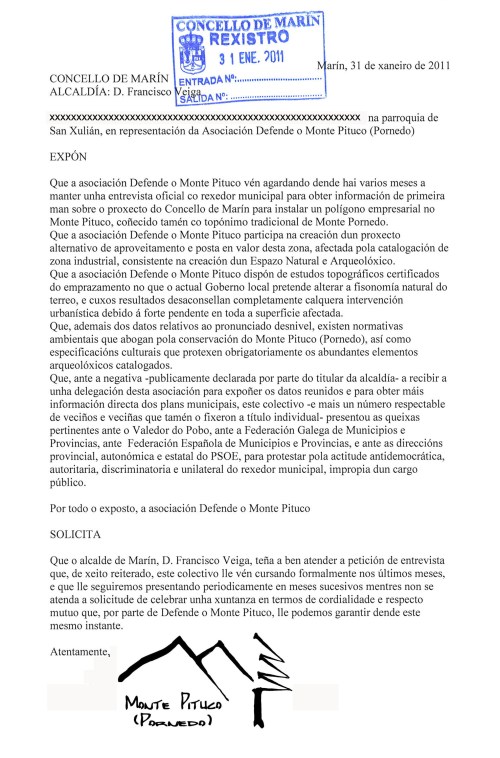 …Voltamos á carga, unha vez máis. Mudamos o ano 2010 polo 2011 e seguimos, tamén neste recén finalizado mes de xaneiro, demandando que o alcalde de Marín, Francisco Veiga, nos reciba -como recibe oficialmente a outros colectivos de veciños- e nos informe, con datos reais, dos plans que ten o Goberno local actual para o Monte Pituco (Pornedo) a medio-longo prazo. E “aseghún” lle vaia nas furnas o próximo 22 de maio. Nós polo pronto, agardamos que lle vaia non mal, senón fatal. Tamén neste recén estreado mes de febreiro estaremos no Rexistro do Concello para selar outra petición, dando case por suposto -seica a esperanza é o último que se perde- que vai facer un avión co noso modesto escrito. Quédannos marzo e abril para seguir pelexando, pola vía do diálogo. En maio pelexaremos coa forza do voto.