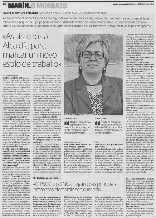 É unha das frases máis destacadas da entrevista que hoxe publica Diario de Pontevedra coa candidata de Marinenses Independentes á alcaldía, Isabel Martínez Epifanio. En DEFENDE O MONTE PITUCO (PORNEDO) damos fe de que así foi, verbalizando queixas que o alcalde se empeñou en contestar co silenzo e a indiferenza. E aínda apreciando a interlocución de Mar-In, as intervencións oportunas e máis que correctas dos seus representantes no Pleno, xorde unha dúbida existencial: con que partido chegarían a pactar, chegado o momento?