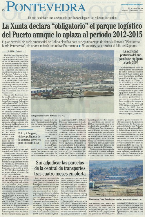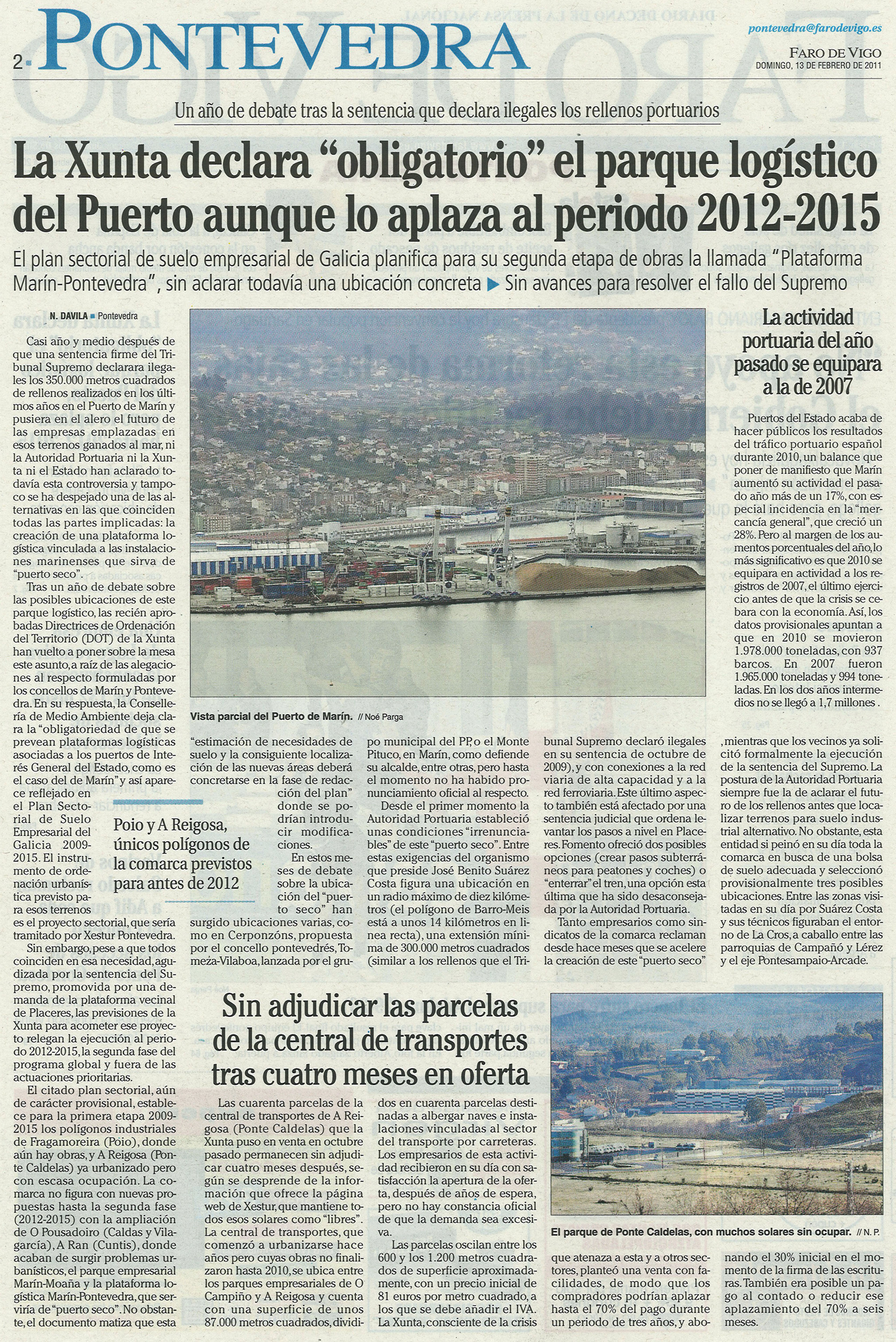 “…En estos meses de debate sobre la ubicación del “puerto seco” han surgido ubicaciones varias, como en Cerponzóns, propuesta por el concello pontevedrés, Tomeza-Vilaboa, lanzada por el grupo municipal del PP, o el Monte Pituco, en Marín, como defiende su alcalde, entre otras, pero hasta el momento no ha habido pronunciamiento oficial al respecto”. (Faro de Vigo, 13 de febreiro de 2011).