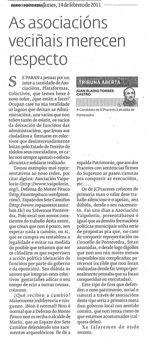 Xoán Eladio Torres asina unha carta publicada en Diario de Pontevedra na que se queixa polo trato despectivo e a falta de respecto coa que os dirixentes políticos actúan ante certos colectivos sociais e veciñais que lles resultan incómodos. Traballador e sindicalista, dirixente veciñal, divulgador da paisaxe e do patrimonio de Galicia, e candidato á alcaldía de Pontevedra en representación de Iniciativa Cidadán Os Praceres (ICP), Xoán Eladio Torres -Xoan Arco da Vella na súa dimensión máis artística- critica a desfachatez do alcalde de Marín pola súa negativa reiterada e desafiante a recibir a DEFENDE O MONTE PITUCO e a coñecer o proxecto de creación do Espazo Natural e Arqueolóxico dos Sete Camiños.