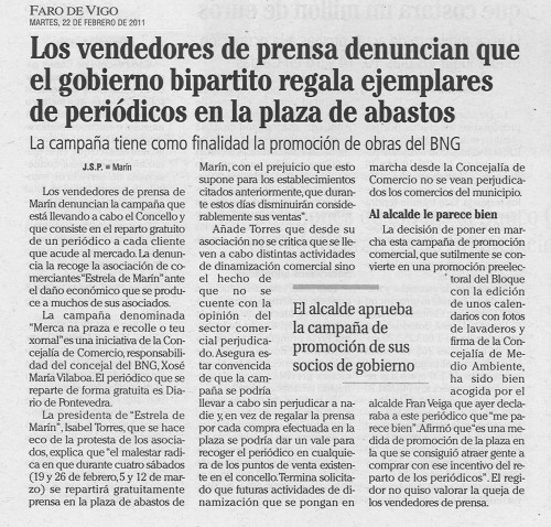 …E mentres, o alcalde, Francisco Veiga, non quere. Non quere isto, non quere o outro. Desta volta, ao que se nega e a oír falar das queixas da Asociación de Comerciantes Estrela de Marín polo reparto gratuito de exemplares de xornais. Cuestións de tipo discrepante, prezados amig@s de Estrela de Marín, dirímeas o noso esforzado, dialogante e comprensivo alcalde en dous sitios: por teléfono e nas escaleiras do Concello.