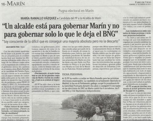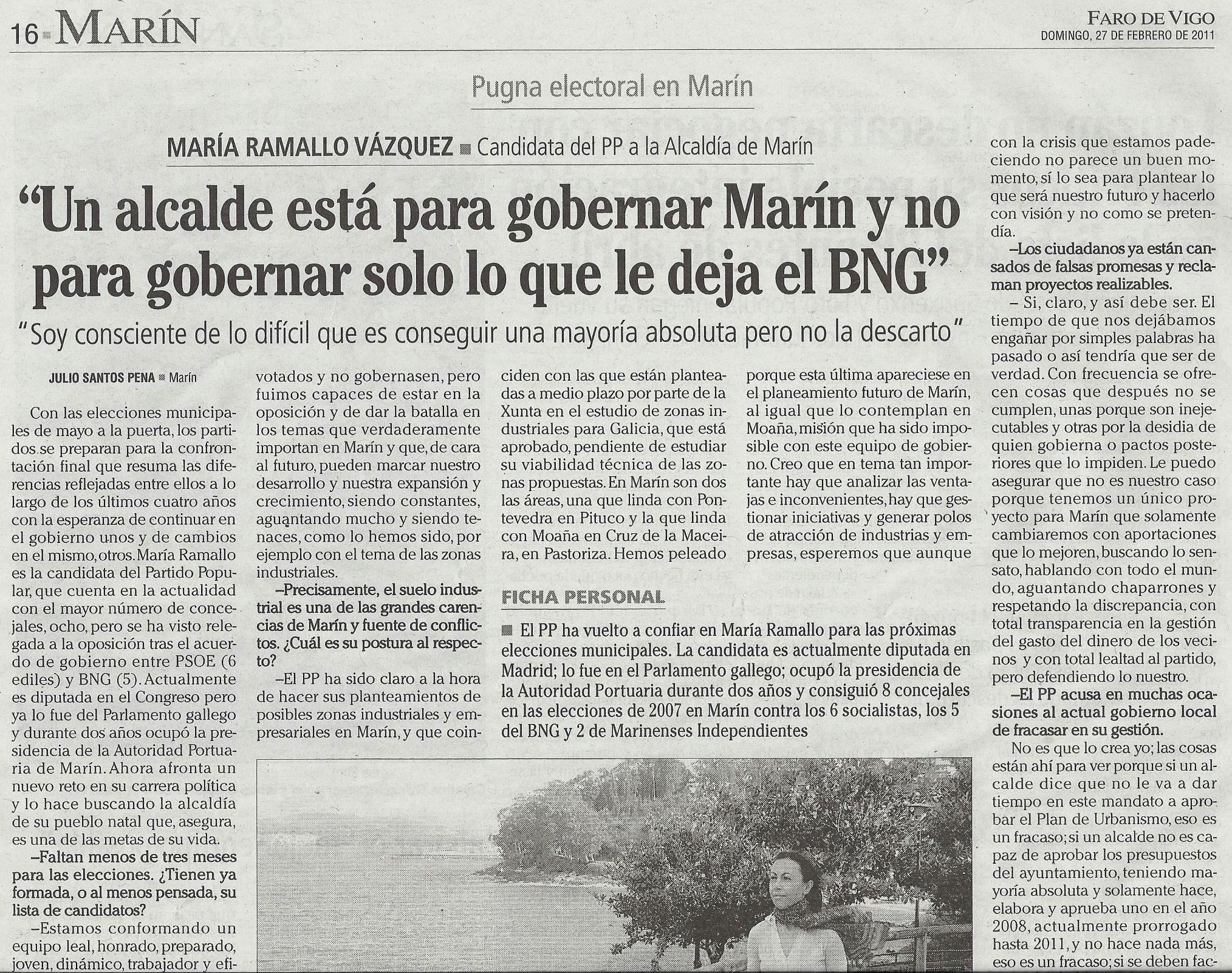 “El PP ha sido claro a la hora de hacer su planteamientos de posibles zonas industriales y empresariales en Marín, y que coinciden con las que están planteando a medio plazo por parte de la Xunta en el estudio de zonas industriales para Galicia, que está aprobado, pendiente de estudiar su viabilidad técnica de las zonas propuestas. En Marín son dos las áreas, una que linda con Pontevedra en Pituco y la que linda con Moaña en Cruz da Maceira, en Pastoriza. Hemos peleado porque esta última apareciese en el planeamiento futuro de Marín, al igual que lo contemplan en Moaña, misión que ha sido imposible con este equipo de gobierno. Creo que en un tema tan importante hay que analizar las ventajas e inconvenientes, hay que gestionar iniciativas y generar polos de atracción de industrias y empresas, esperemos que aunque con la crisis que estamos padeciendo no parece un buen momento, sí lo sea para plantear lo que sería nuestro futuro y hacerlo con visión y no como se pretendía”. (María Ramallo, candidata do PP á alcaldía de Marín).