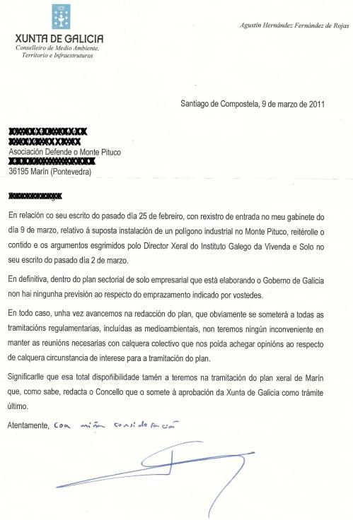 O conselleiro de Medio Ambiente, Territorio e Infraestruturas, Agustín Hernández, vén de contestar o escrito no que DEFENDE O MONTE PITUCO (PORNEDO) lle pide a información que o Concello de Marín se nega sistematicamente a darnos, nunha evidentísima mostra de opacidade e prepotencia por parte do alcalde, Francisco Veiga. O conselleiro exprésase na liña do exposto con anterioridade polo director xeral do Instituto Galego de Vivenda e Solo, Antonio J. Boné, (artigo titulado “CARTA DO IGVS SOBRE O CHAN INDUSTRIAL“) e, sen que pareza que as súas palabras se poidan interpretar nun sentido diferente, afirma o que segue: