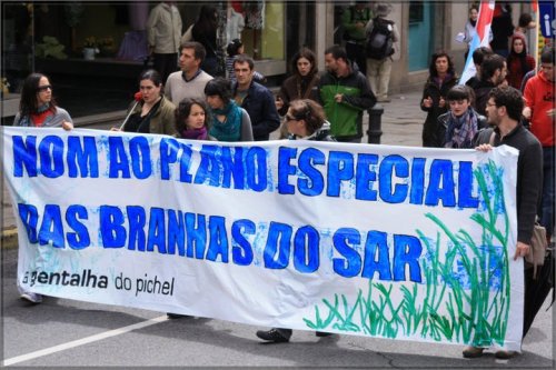 …Non se pode consentir a súa destrucción salvaxe, por iso os veciños e veciñas erguémonos contra os intereses económicos, políticos e urbanísticos que pretenden sacrificar esta riqueza única, insustituible e irrepetible, comprando vontades, enganando a cidadanía, prometendo o ouro e o mouro en tempos de crise. A río revolto, ganancia de especuladores. Mais non aquí.