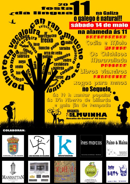 En vésperas do Día das Letras Galegas, que está adicado ao poeta Lois Pereiro, a Asociación Cultural Almuinha celebra por cuarto ano a Festa da Lingua. A partir das 11:00 horas a Alameda de Marín será o escenario dun un amplo abano de actividades: o grupo de música tradicional Os Chichisos, e as pandereteiras e pandereteiros de Maravallada, amenizarán a xornada; haberá unha solta de libros infantís para insuflar espírito lector entre os máis novos; os máis cativos tamén poderán asistir á sesión de contacontos do grupo Codia e Miolo, ademais de participar en xogos populares.
