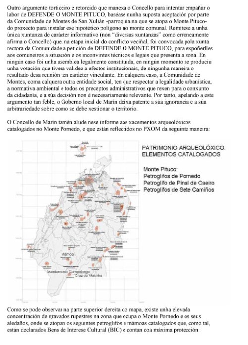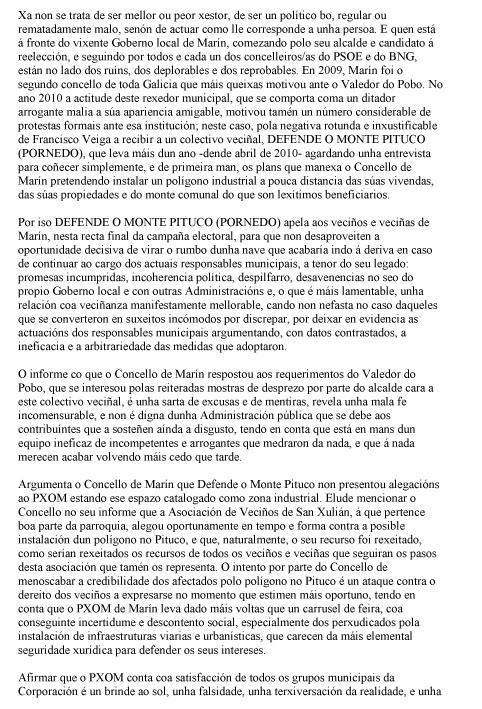 O Valedor do Pobo completou a súa carta adxuntando un breve “informe” que lle achegou o Concello de Marín “xustificando” a súa actuación con respecto a DEFENDE O MONTE PITUCO. Un informe manipulado e absolutamente parcial, cheo de inconcrecións e medias verdades, co que o alcalde de Marín e o seu Goberno coaligado pretendían enganar ao Valedor do Pobo e deslexitimar as reivindicacións veciñais.